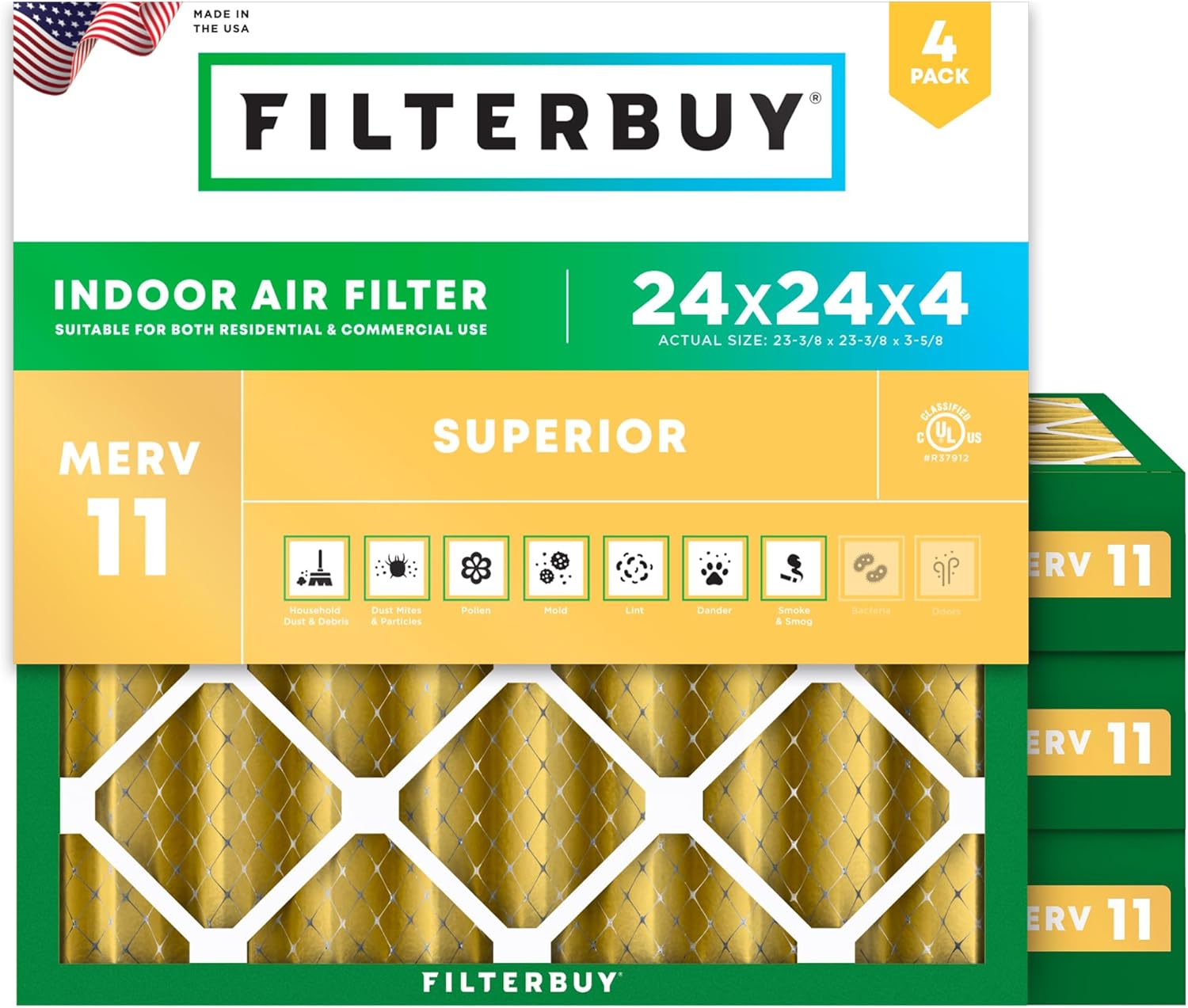 Filterbuy 24x24x4 Air Filter MERV 11 (MPR 1200) Allergen Defense Replacement (4-Pack), Electrostatic Pleated HVAC AC Furnace Filters, Made in USA (Actual Size: 23.38 x 23.38 x 3.63)