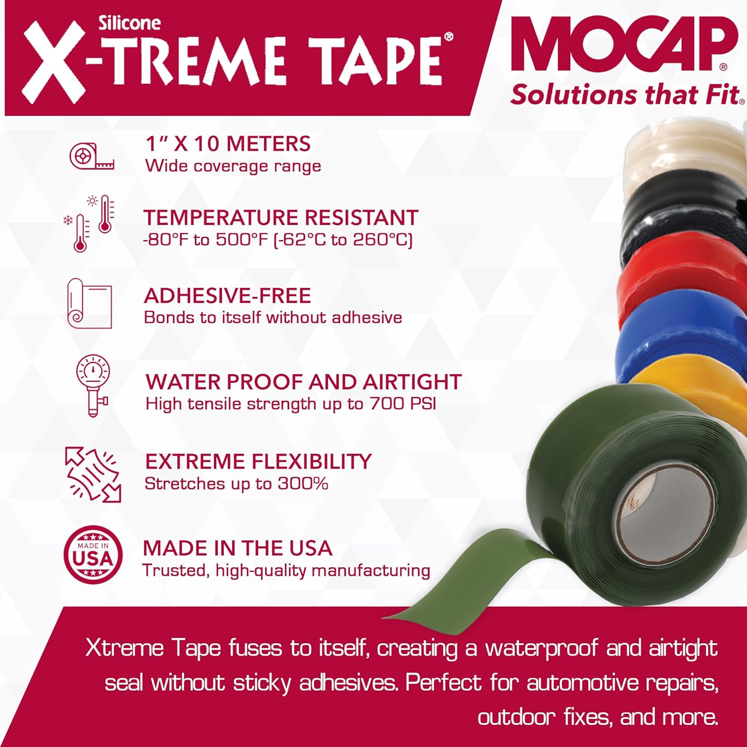 - DEPENDABLE QUALITY MADE IN THE USA β Manufactured to meet high standards, MOCAP X-Treme Tape delivers professional-grade performance for industrial, commercial, and DIY repairs. Originally developed for demanding environments, it ensures secure, long-lasting insulation and leak protection wherever you need it.