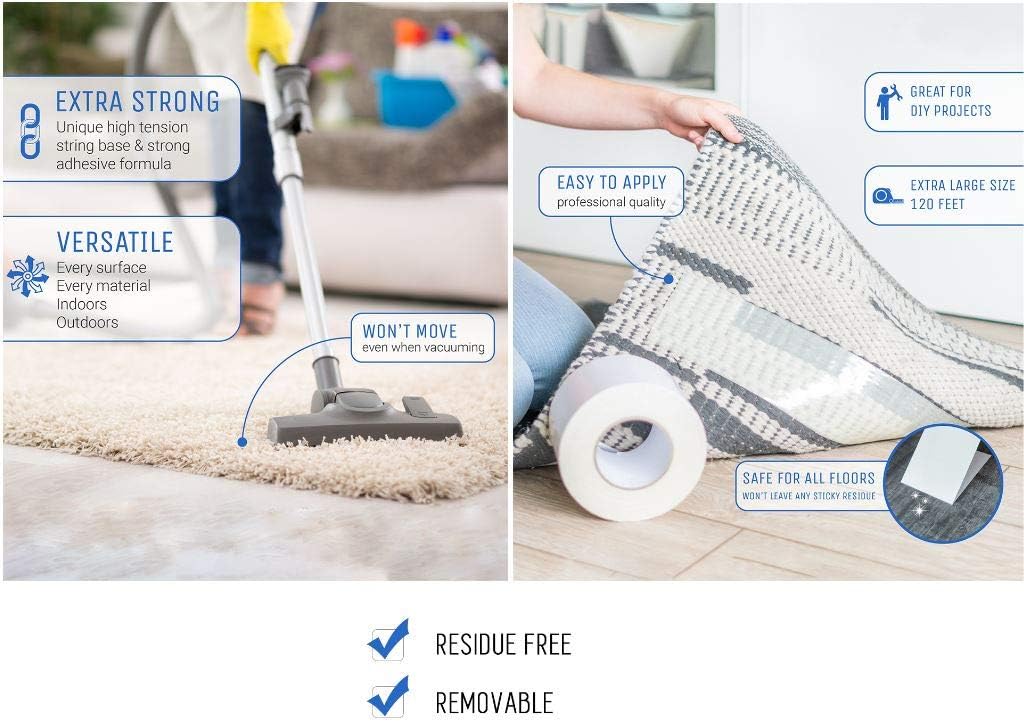 - Easy To Use - Our double-sided carpet tape is specifically designed to cut easily and is frustration-free. The back surface peels off and sticks firmly to the surface. Comes off without leaving residue or staining. Our premium heavy-duty double-sided tape is designed to withold almost any surface and weather conditions. For both indoor and outdoor use.