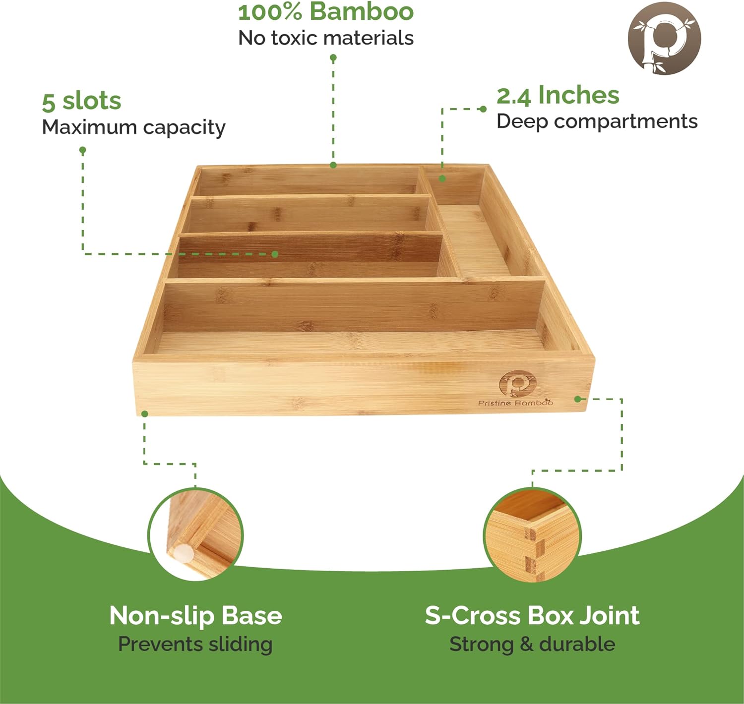 - SLIP RESISTANT & DEEPEST in the market: The only silverware drawer organizer that is slip-resistant and 2.4" deep. This deep silverware tray Increases storage capacity in your kitchen drawer to best fit a variety of utensils (internal depth 2โ). The non-slip silicone feet keep your bamboo utensil holder in place. So donโt worry, your flatware organizer tray will not move to the back of the drawer ever.