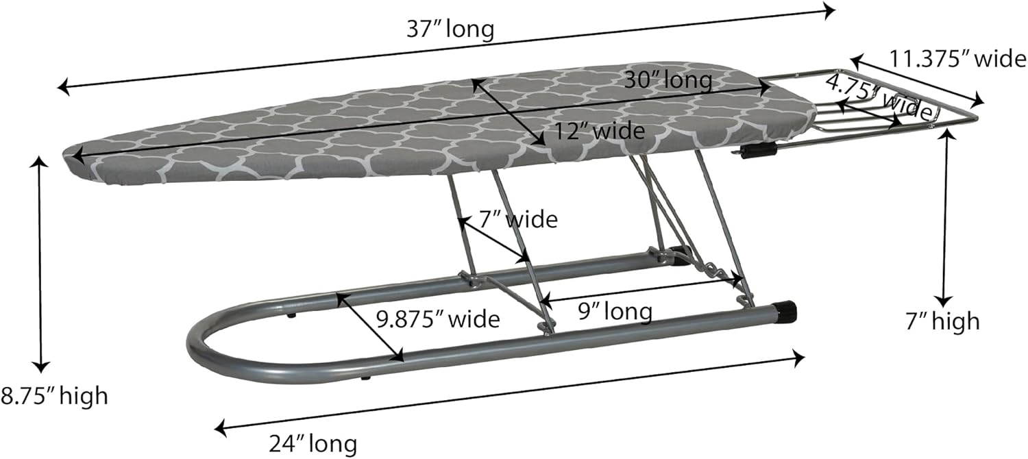 - Product Dimensions – Open: 5”H x 12”W x 36.5”L (with iron rest); Closed: 1.5” x 12” x 35.5”; Ironing Surface: 12” x 30”.