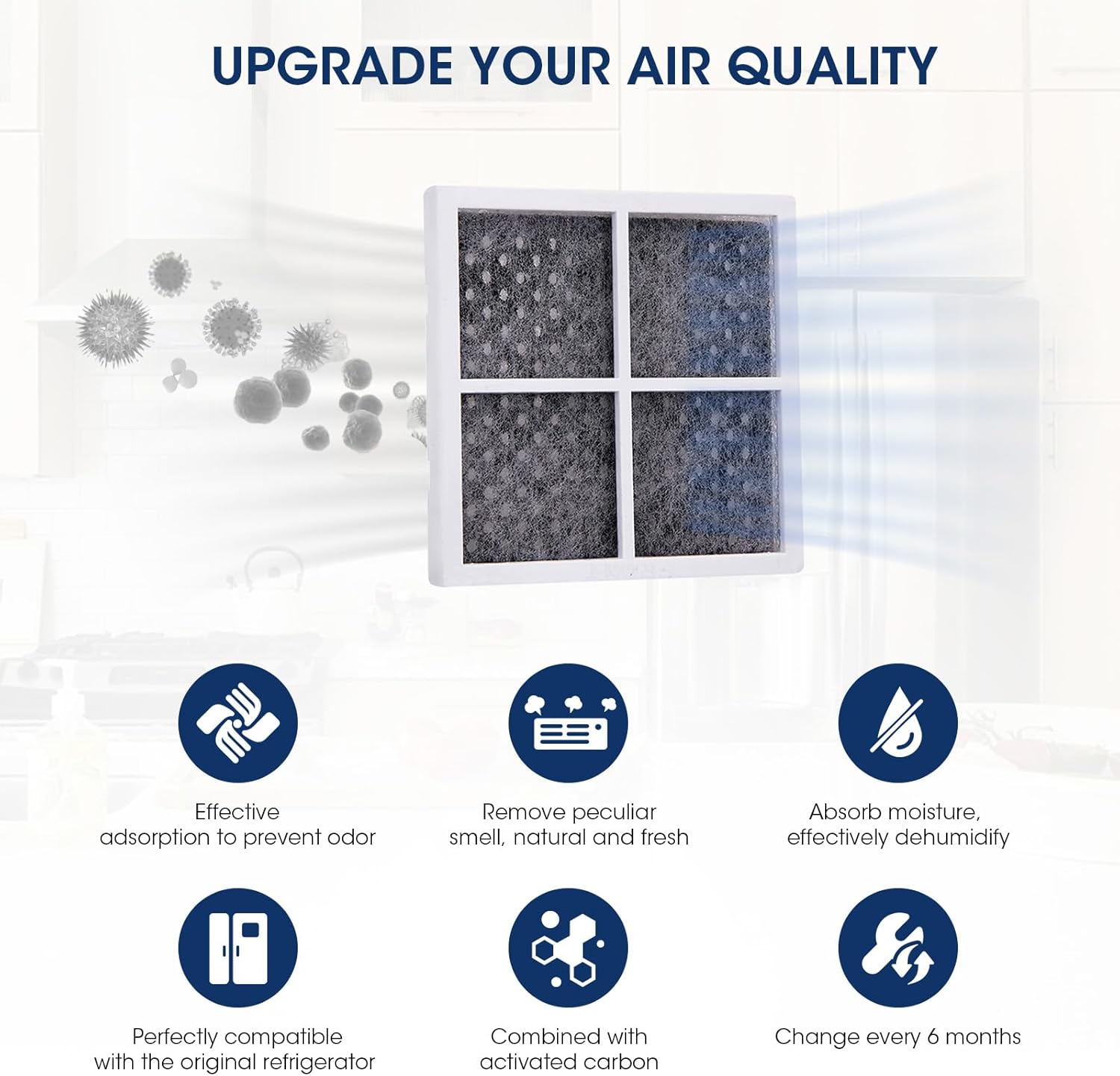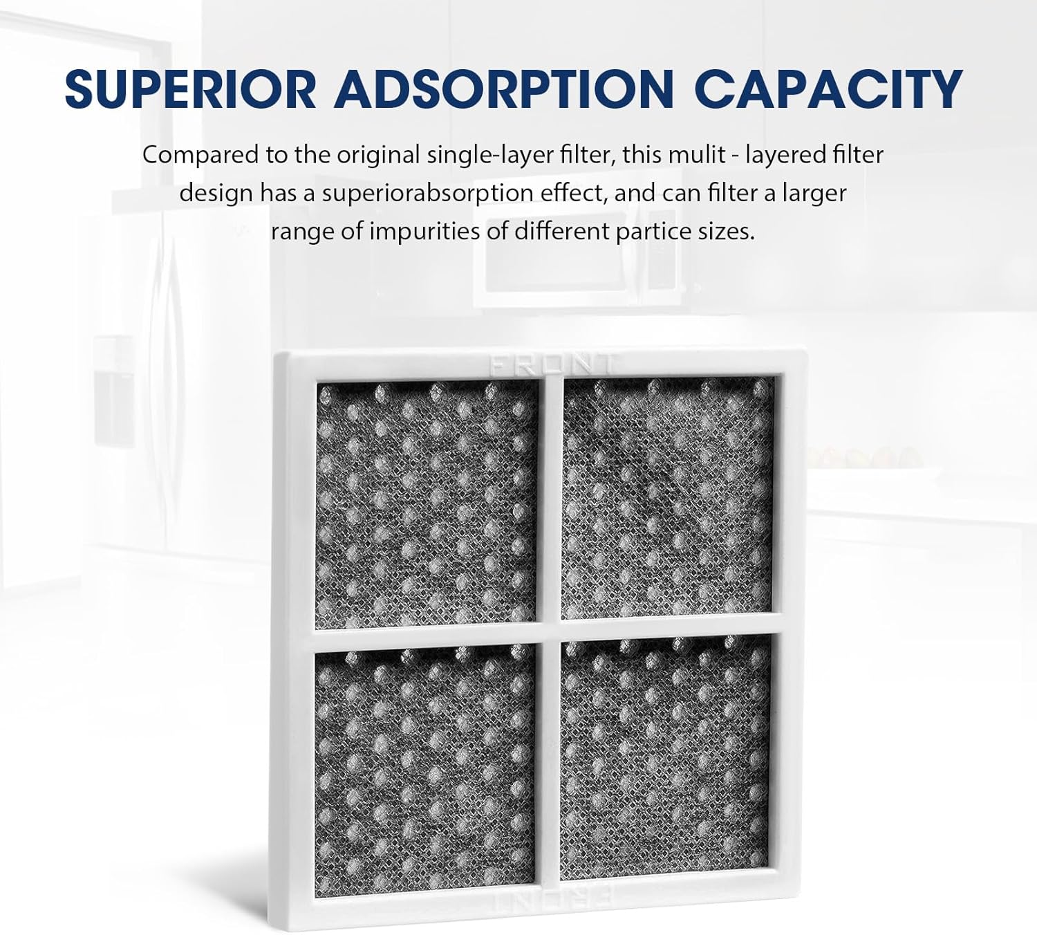 - Premium Triple Action Filtration: Refrigerator Air Filter Replacement for LG LT120F is filled with activated carbon in the three layers of filtration, which has a stronger filtration effect on ultra-fine particles below 0.1um and reduces odors 28 times more effectively than baking soda. β Non-woven cloth: remove big substances. β‘ Activated carbon fiber: With a strong ability to absorb odor, smoke, etc. β’ Activated carbon sponge: With high dirty holding ability also has a long service life.This results in the cleanest-smelling, sterile refrigerator air space.