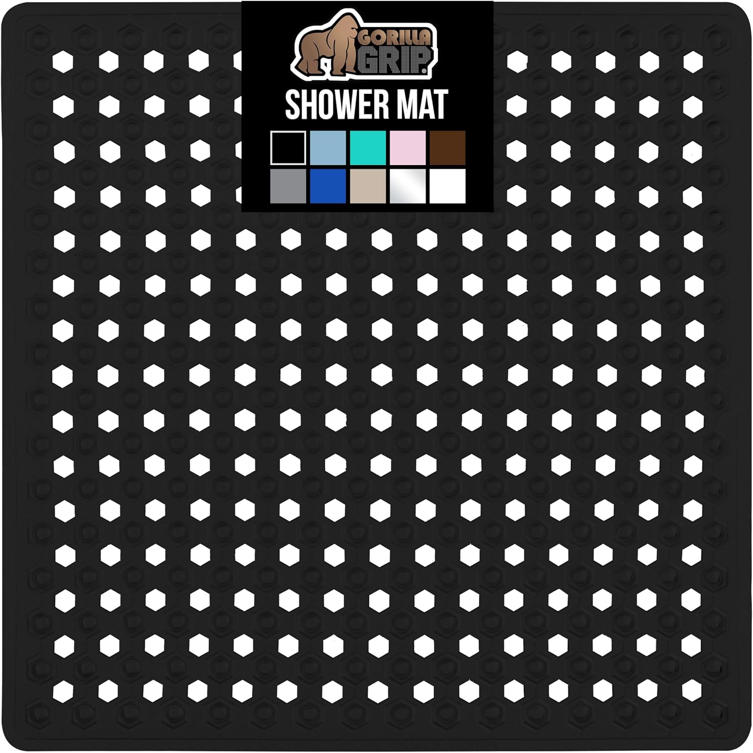 GORILLA GRIP Patented Square Shower Stall Mat, Small Bathtub Floor Mats for Stand Up Showers, Suction Cups and Drainage Holes, Machine Wash, Soft on Feet, Bathroom Accessories 21x21 Inch, Black Opaque