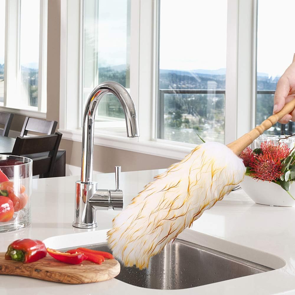 Lambswool Duster with Solid Wooden Handle,Leather Hang Strap,18.9 inch Long,Natural Feather Duster for Cleaning Ceiling Fans,Window Blinds,Computer Screens,Bookshelves etc