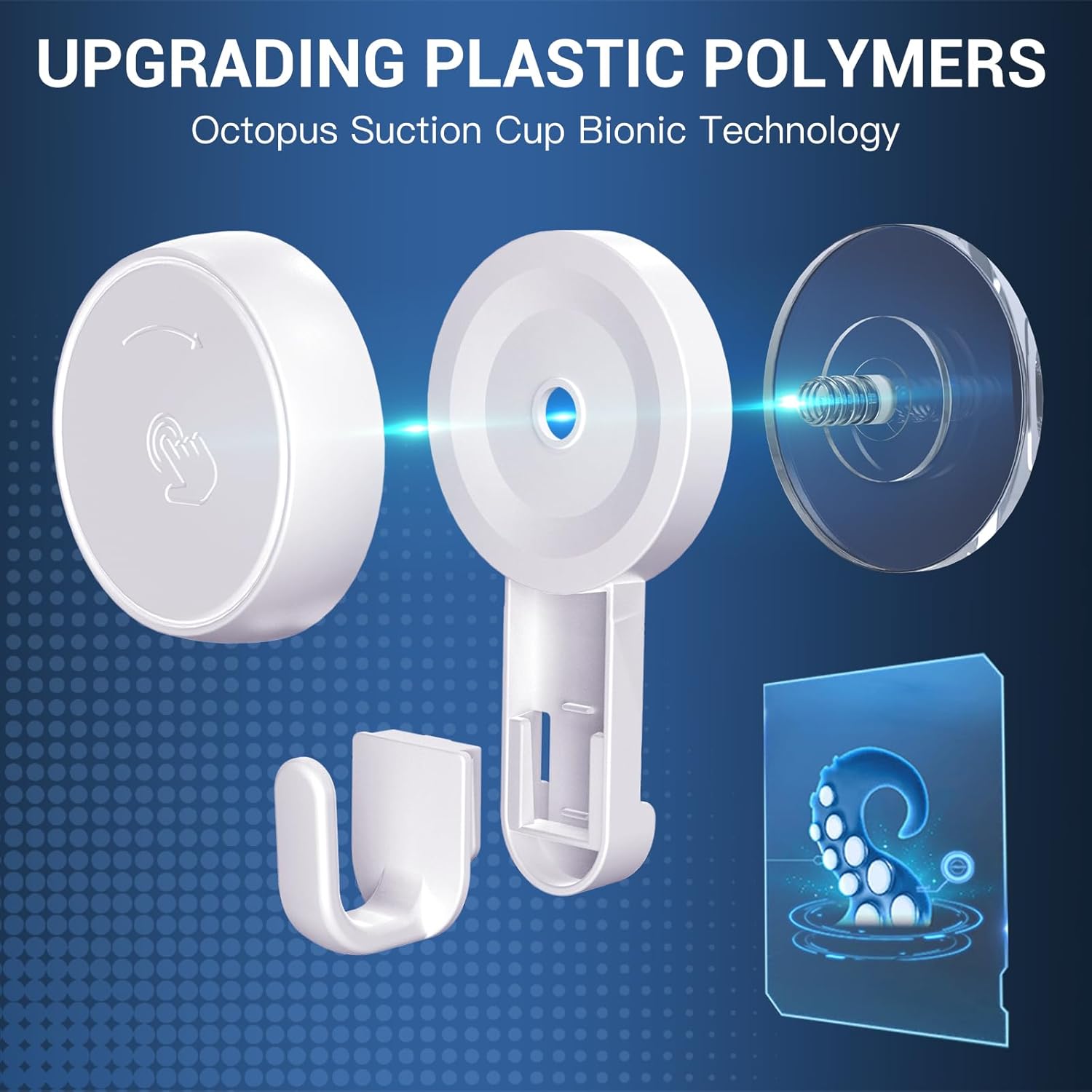 - 【1 SECOND INSTALL WITHOUT TOOLS】 No tools, no screws and no drilling holes on your wall by using the waterproof suction hooks. Simply choose a smooth surface, peel off the film and push the hook to the surface and Turn right until it is fully tightened ! The Vacuum suction hooks install finished.