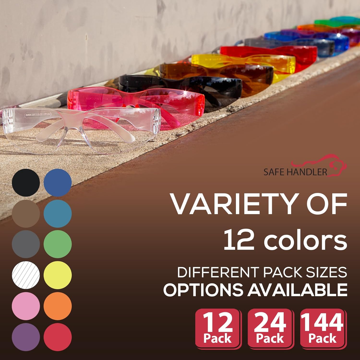 - SAFE HANDLER by Bison Life - Hyline Safety Glasses, Color Lens, Color Temple, 12 assorted colors in one box, 1 of each color: pink, red, orange, yellow, purple, green, black, turquoise, grey, blue, brown, clear