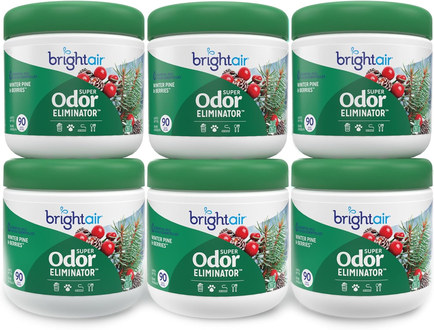 Bright Air 14 oz. Super Odor Eliminator, For Medium-Size Spaces, Winter Pine & Berries Scent, Case of 6, Odor Eliminator & Air Freshener, Natural Essential Oils, Lasts Up to 90 Days Each