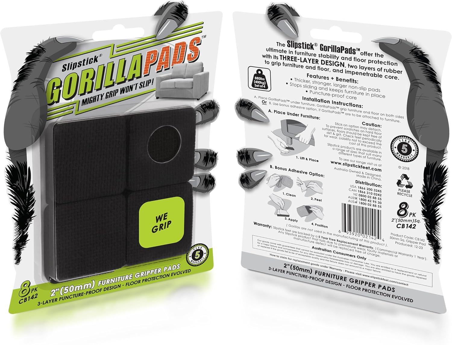 - Mighty grip that won’t slip – GorillaPad furniture grippers by Slipstick are the universal solution to stop furniture from sliding, prevent unwanted movement of furniture / objects, and effectively protect hard surfaces from scratches or damage. Includes 8 premium 2 inch square non slip furniture pads.