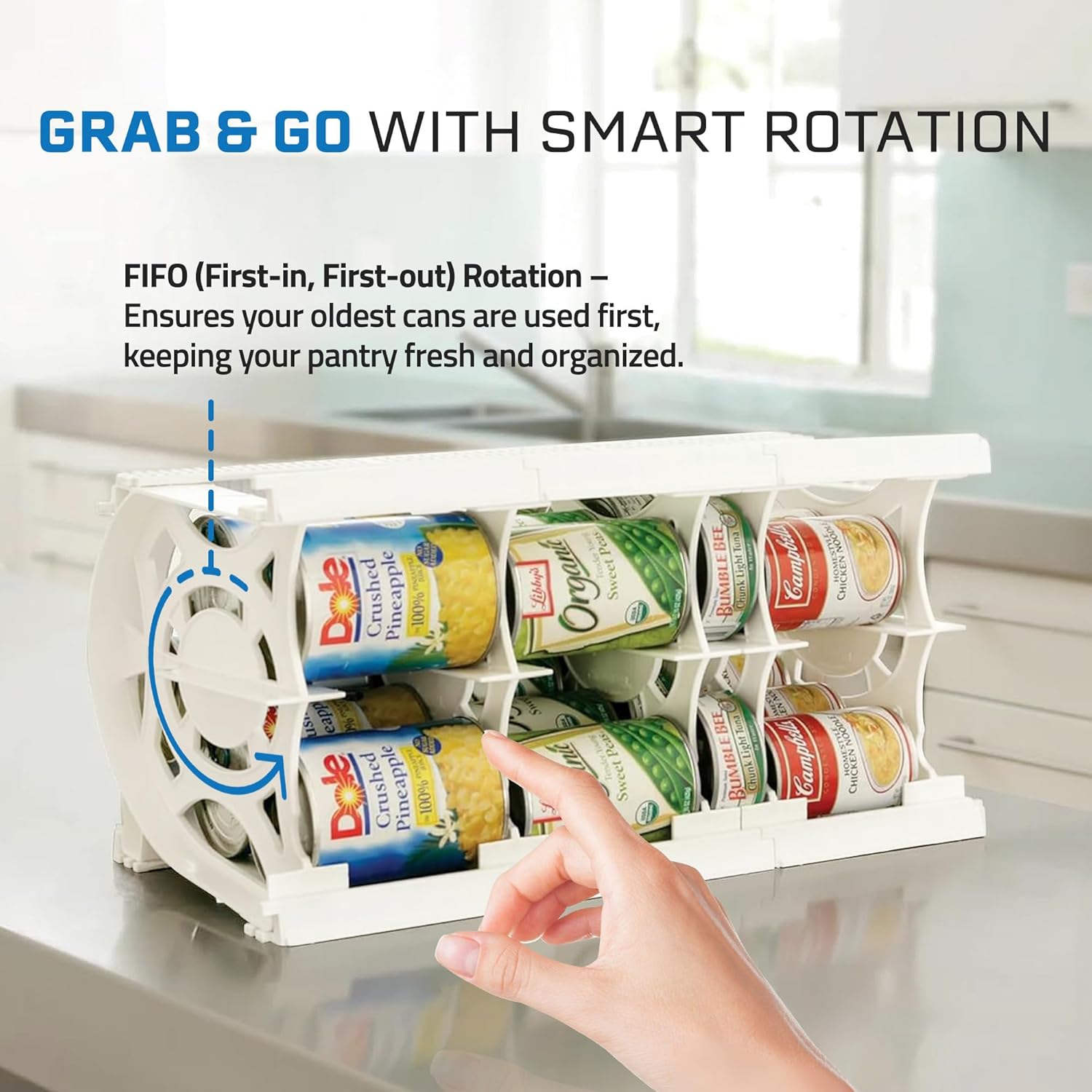 - GRAB & GO WITH SMART ROTATION - Our patented FIFO (First-in, First-out) rotating system ensures your oldest cans are used first, keeping your pantry fresh and organized. Every time you grab a can, the next one rolls forward, so nothing gets lost or forgotten in the back.
