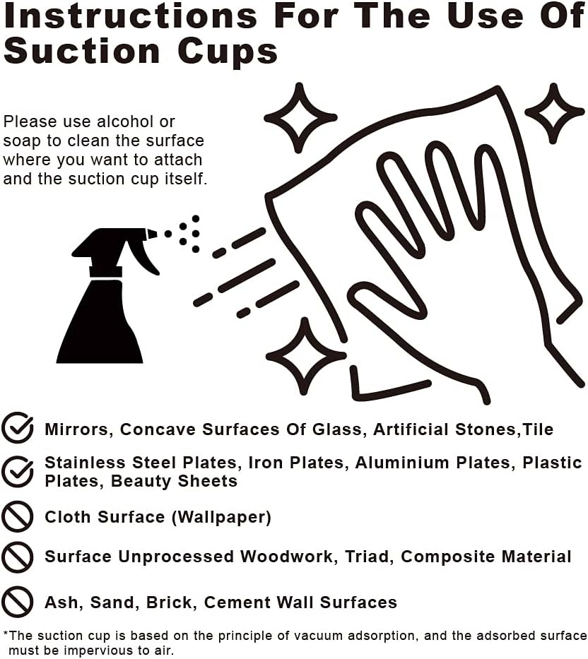 - Easy Tips for Better Suction If the suction cup isnโt sticking, try these: 1.Clean both the surface and suction cup with warm soapy water. 2.Soak suction cup in warm water for 1โ2 minutes to soften. 3.Press suction cup head firmly to remove air bubbles. 4.Ensure installation on flat surfaces, not corners or curves.