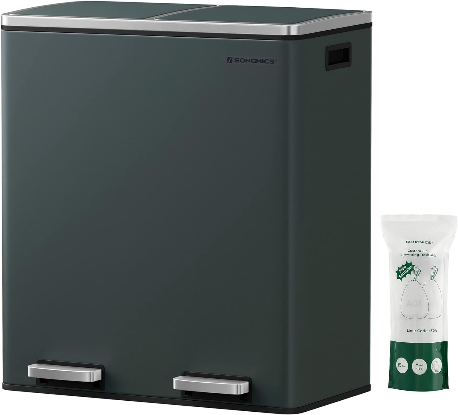 SONGMICS Trash Can, 2 x 8 Gallon (2 x 30 L) Garbage Can for Kitchen, with 15 Trash Bags, 2 Compartments, Plastic Inner Buckets and Hinged Lids, Airtight, Greenish-Gray ULTB60GS02