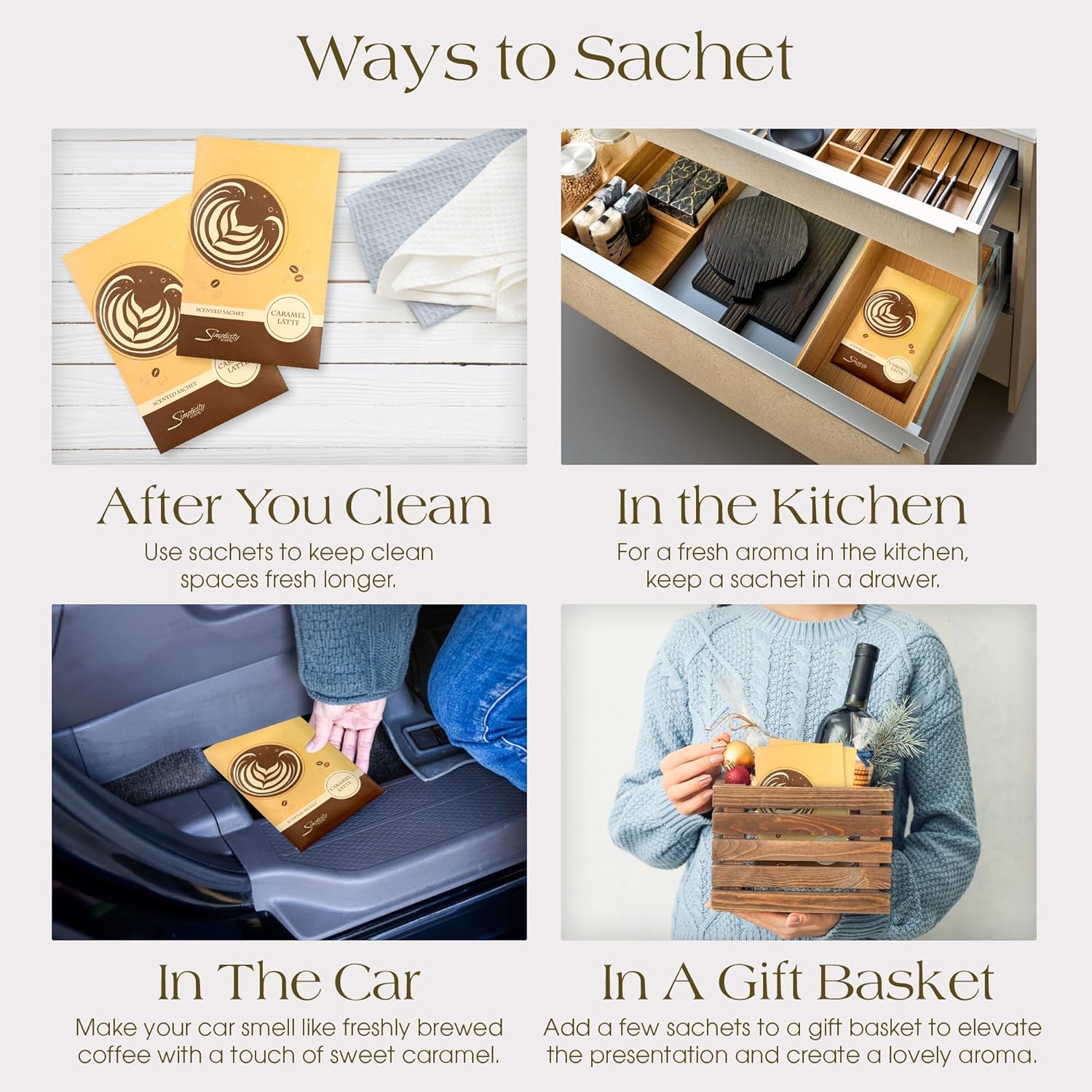 - SEASONAL AND TIMELESS SCENTS : What's a latte without the sweet, creamy aroma of caramel? Our Caramel Latte Sachet brings the irresistible scent of freshly brewed coffee and caramel into your home. Ideal for relaxing with your favorite book or creating the cozy café vibe you love, it fills any room with warmth and a touch of sweetness.