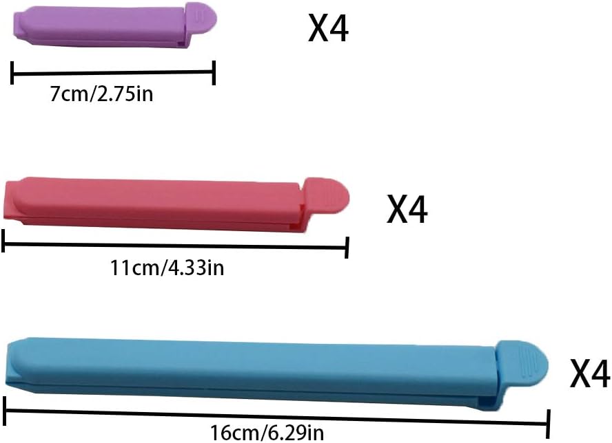 - There are 12 pieces clips ( 2.75 in * 4 Pcs, 4.33 in * 4 Pcs, 6.29 in * 4 Pcs)for you to choose for any sealing bag.