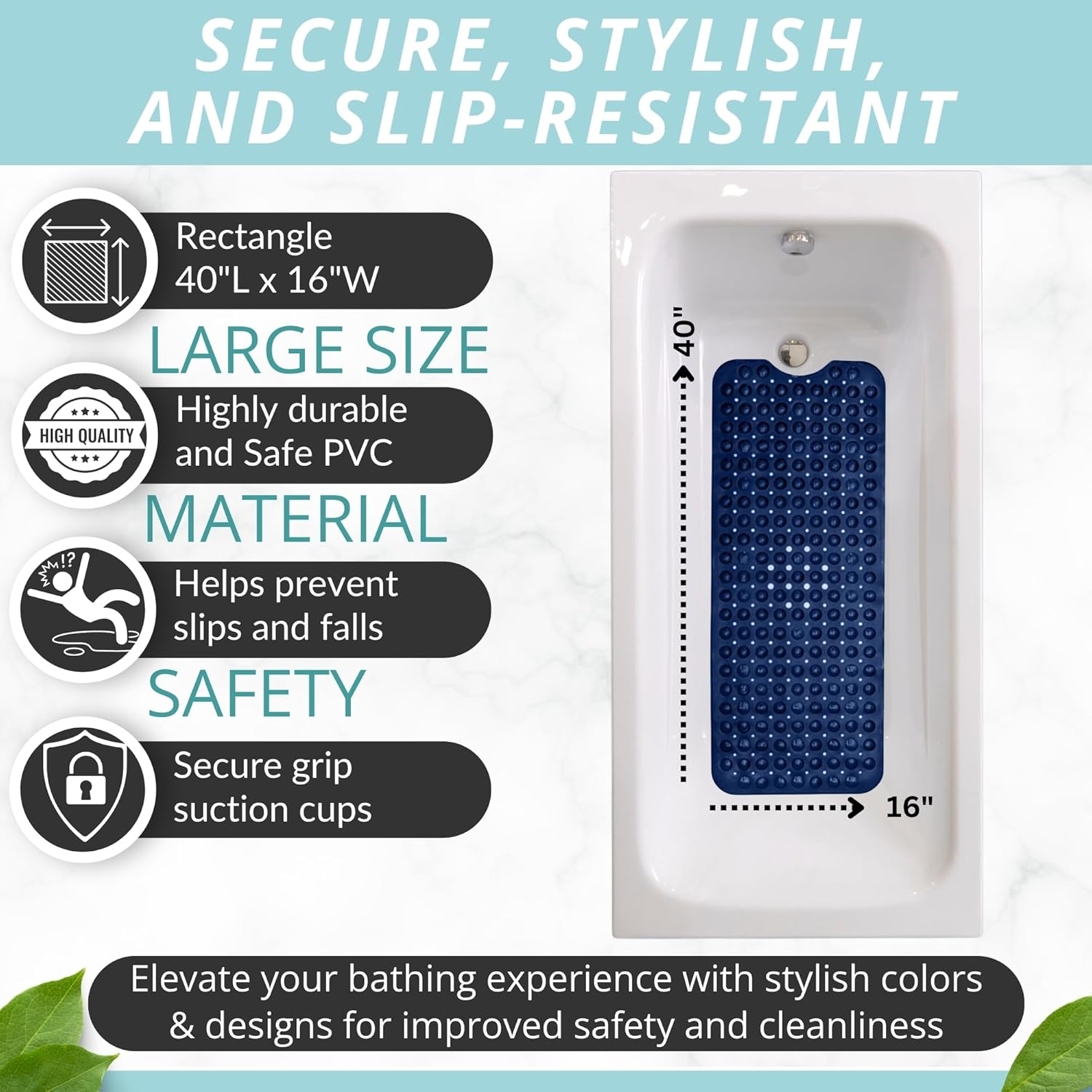 ENKOSI Bath Mat - Large Non Slip Bathtub & Shower Mat - Extra Long 40 x 16 Inch Bathroom Mats for Tub Nonslip Anti Slip Bathmats (40x16 Navy 1-Pack)
