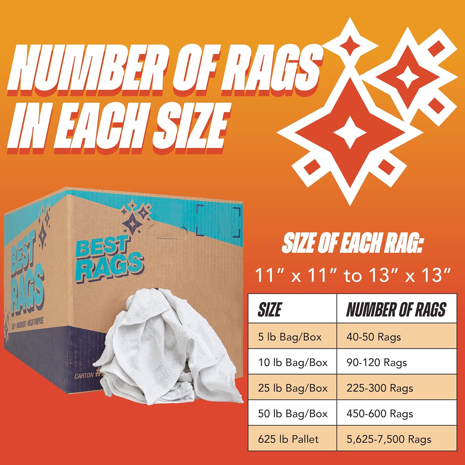 - CHOOSE YOUR RAG PACK: A terry towel rag is more cost-efficient than microfiber cleaning cloths. These terry cleaning towels are available in 5lb and 10lb rag boxes for the home or office, and 25lb and 50lb rag boxes for industrial wiping, construction clean up, and remediation. Need more? We sell these cleaning wipes by the pallet when fulfilled by our warehouse.