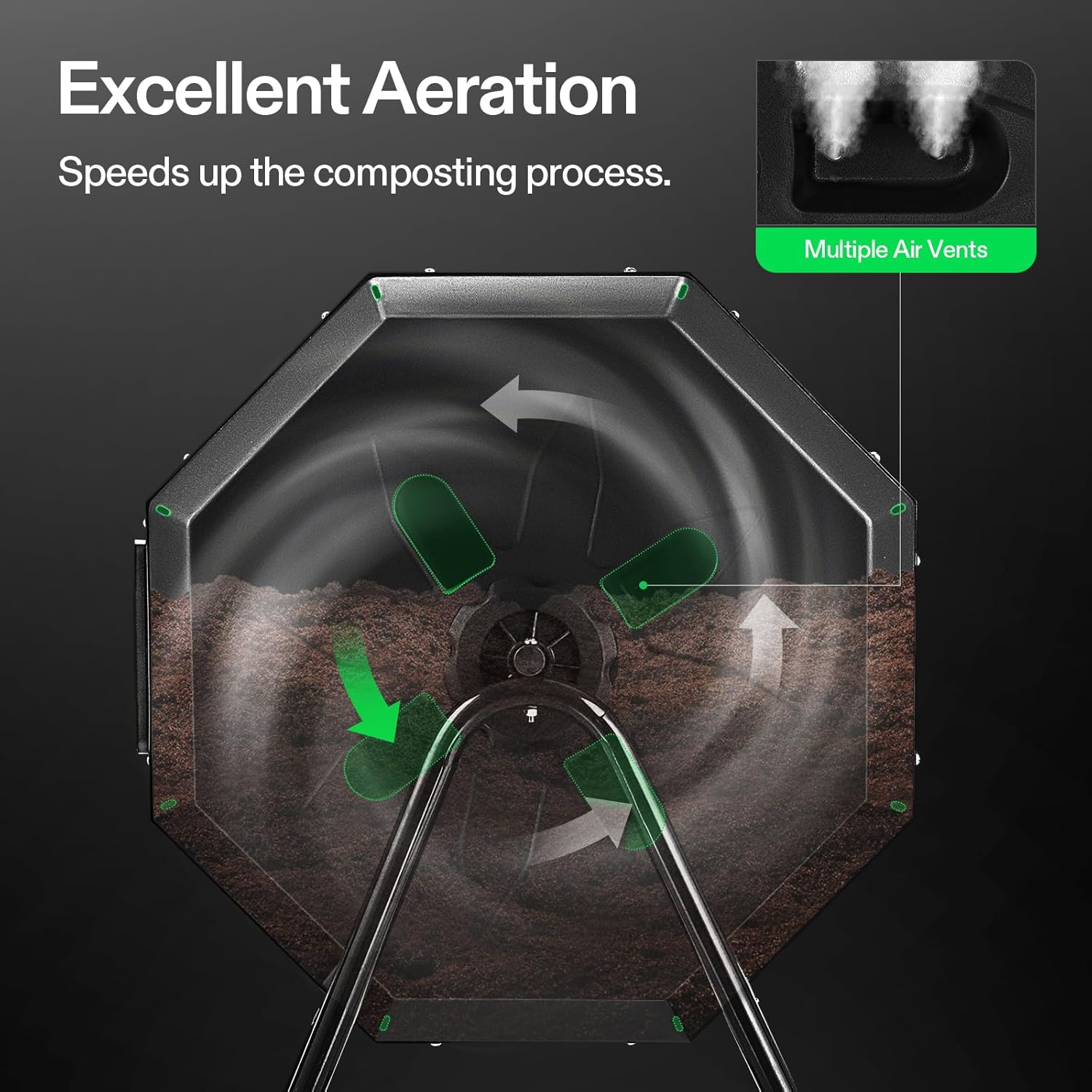 - Twin chambers: Two separate chambers allow one side to finish composting while leaving the other side available to add fresh wastes; Constant alternation of the two sides will create an uninterrupted stream of nutritious compost