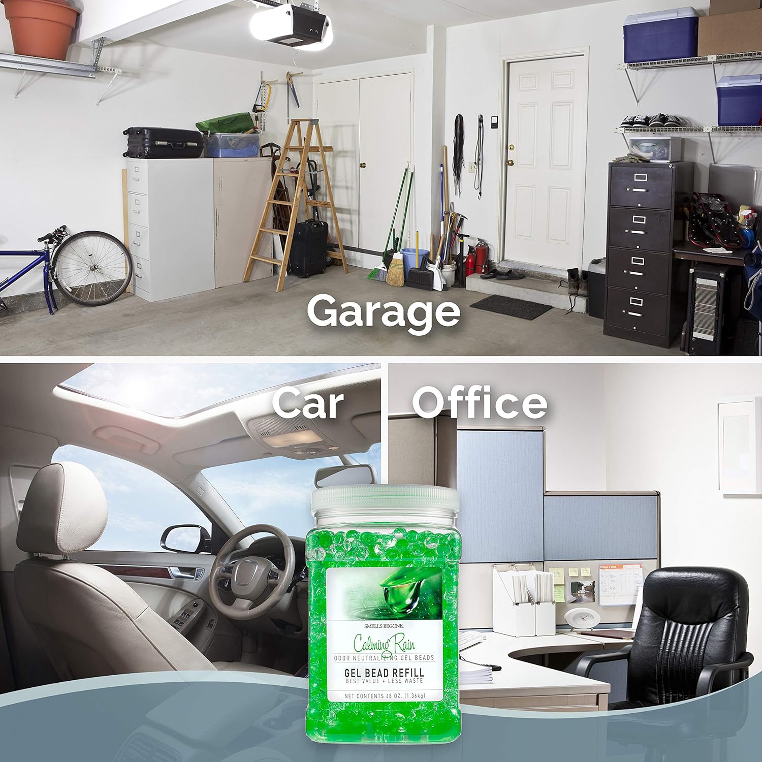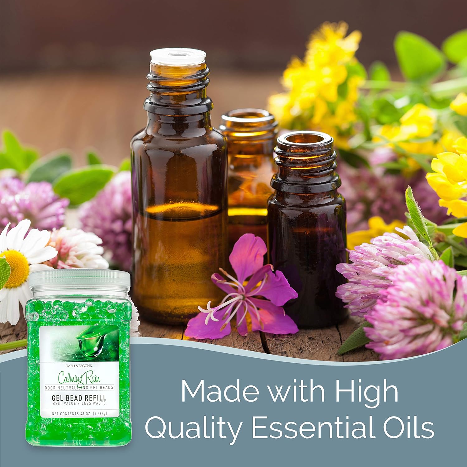 - MADE WITH ESSENTIAL OILS - Each Odor Eliminator Gel Bead jar contains 12 ounces of product and the larger refill jar contains 48 ounces of product. The products are made with plant derived ingredients and formulated with a blend of essential oil based fragrances which adds a distinct and unforgettable aroma to any area you place and use the jar.