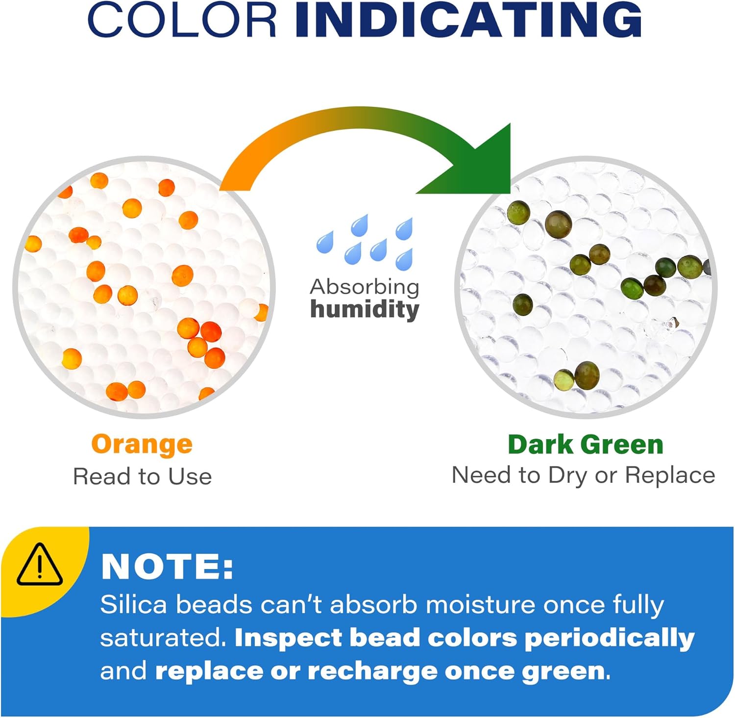 - Good Absorbility: Silica gel can absorb 40% of its weight in water vapor and 15% in the first two hours; No change in size or shape even the silica beads become saturated, feels and looks dry, keep everything dry and safe