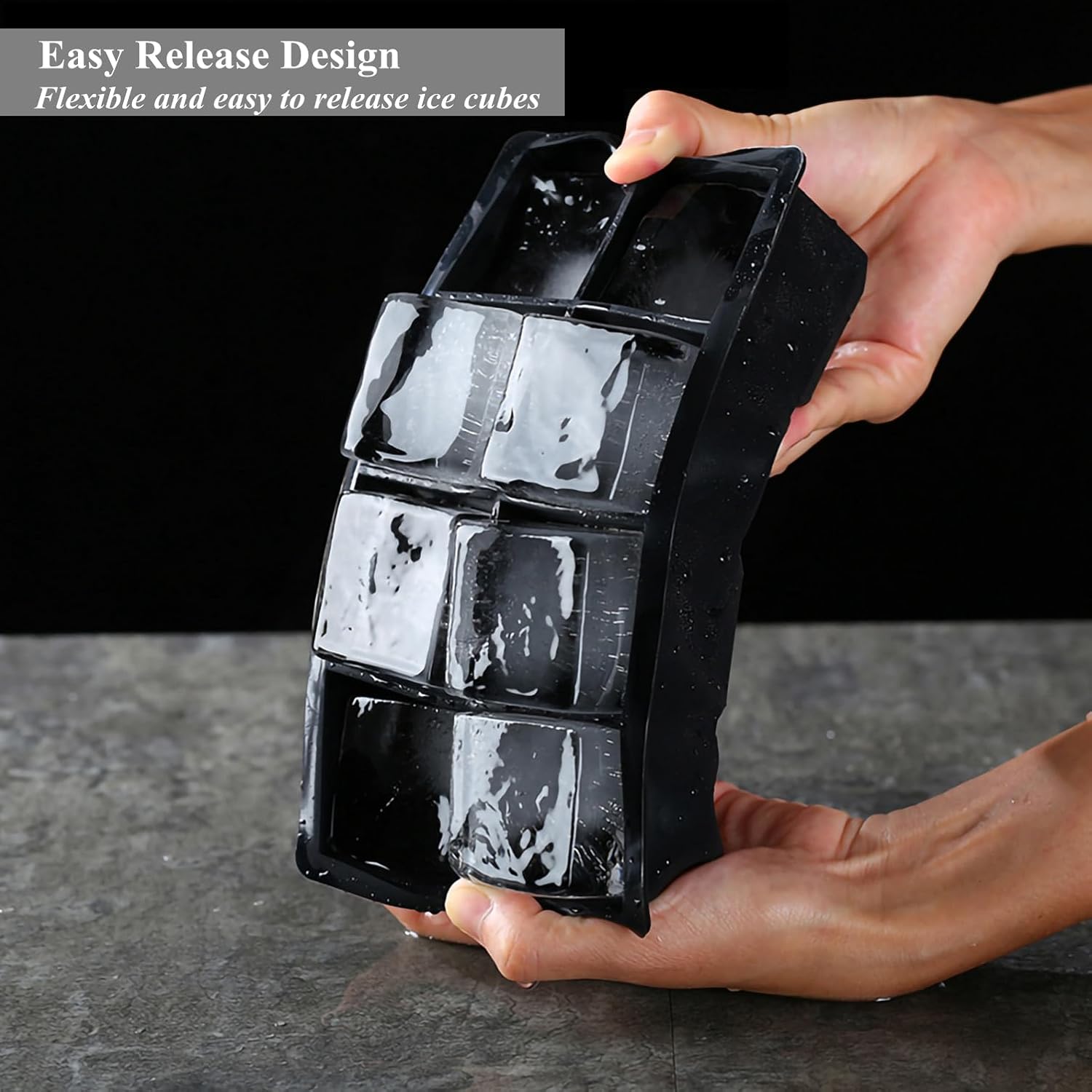 - CREATE BIG SQUARE ICE CUBES:Our ice cube tray size:8.5 x 4.5 x 2 inch. This set includes 2 premium silicone ice trays with 8 large compartments per tray. Your can make 16 giant square ice at once,which melts slowly to keep your Old Fashioned,Scotch,Bourbon,Tequila or other mixed drinks cold to the last drop without diluting it