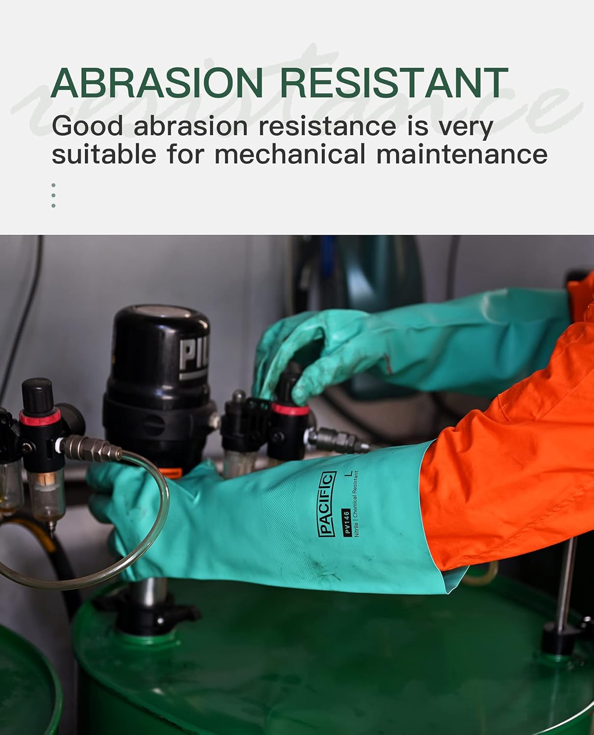 - 𝐒𝐨𝐟𝐭 & 𝐒𝐤𝐢𝐧 𝐅𝐫𝐢𝐞𝐧𝐝𝐥𝐲: The 28 mil (0.7 millimeter) thickness unlined chemical gloves are very soft, easy to pull on and off. The extended cuffs provide effective barrier protection for wrist and forearm from splashes, abrasives and dangerous chemicals.