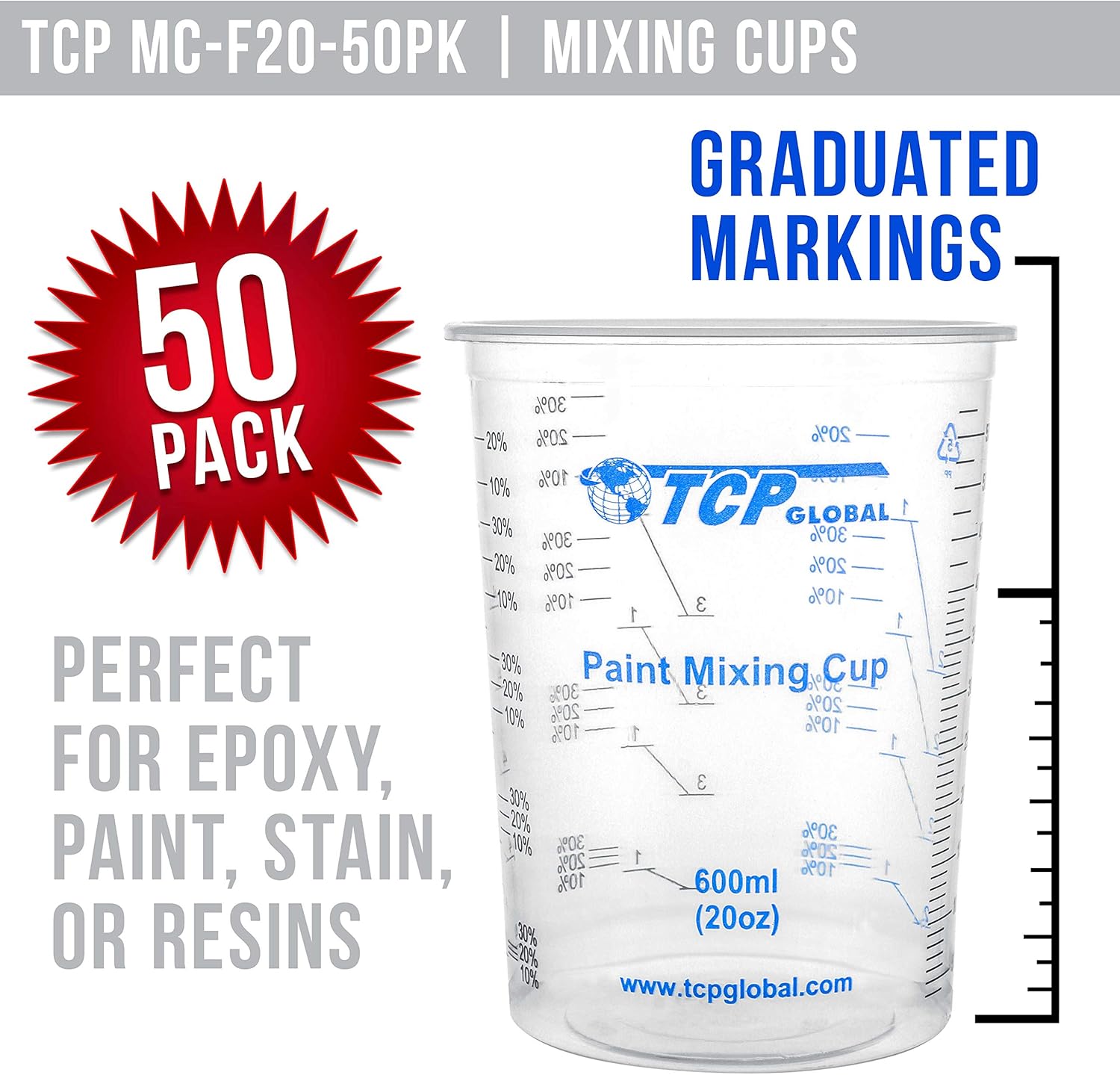 TCP Global 20 oz. (600ml) Graduated Plastic Mixing Cups - Box of 50 with 50 Mixing Sticks - Disposable Plastic Measuring Cups for Liquids, Paints, Resin, Epoxy, Art, Kitchen - Ratios 2-1, 3-1, 4-1 ML