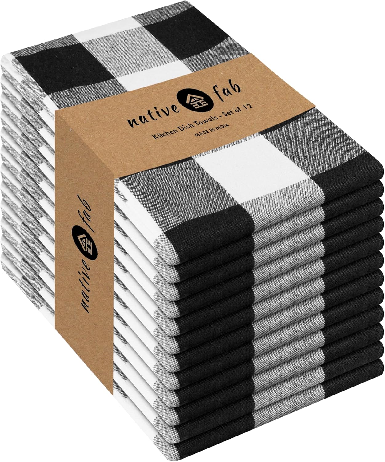 Native Fab 12-Pack Kitchen Towel with Hanging Loop 16x26 inches, Cotton Buffalo Check Kitchen Towels for Cleaning Drying, Washcloths Soft & Absorbent Cloth Rags, Bar Towel, Dish Cloth, Black