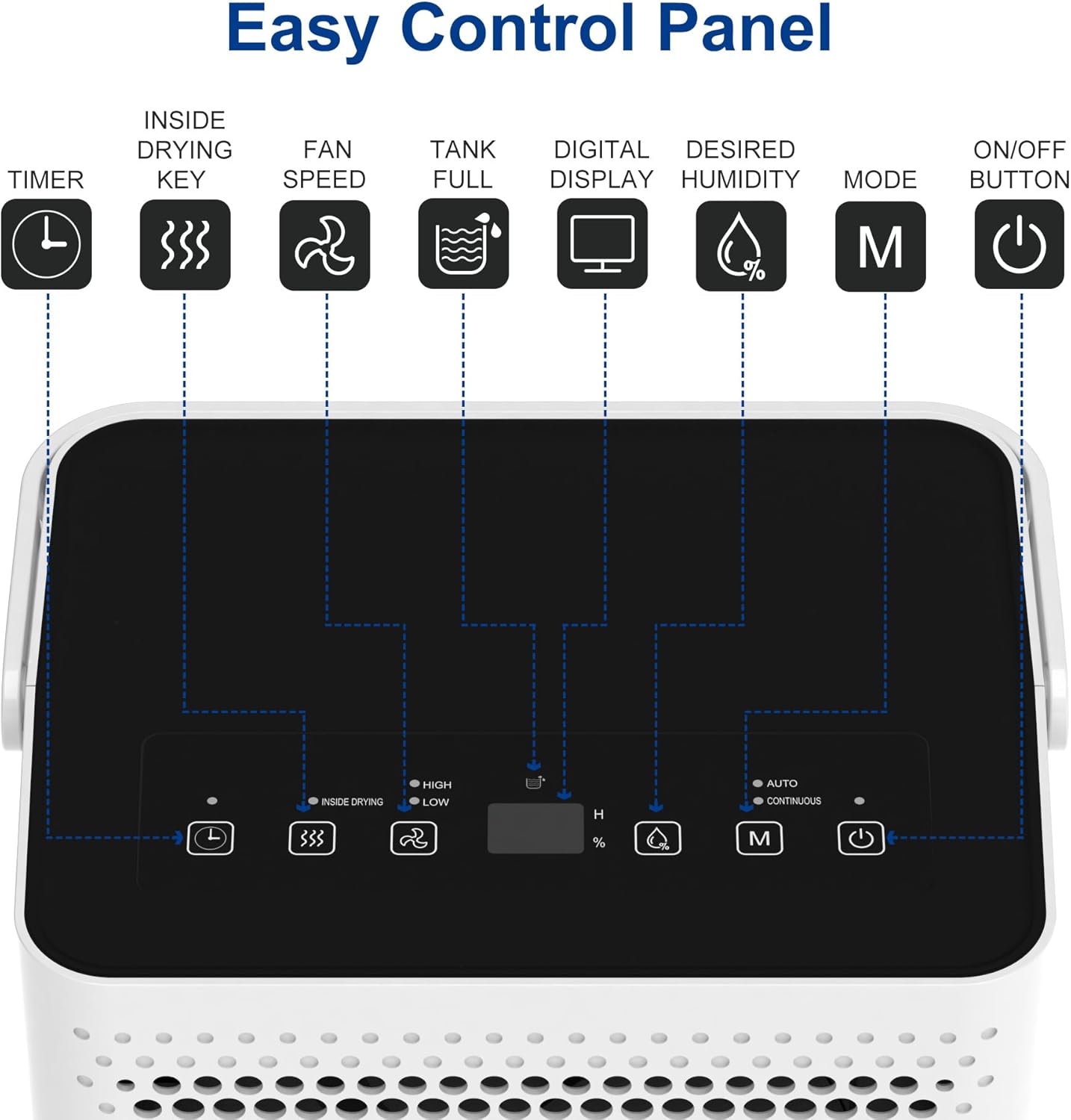 - 【MORDERN DESIGN AND QUIET】- Shinco dehumidifier designed with sleek and modern look. LED display makes it visually shows humidity levels and timer duration, ergonomically lift up handle is easy to move up and down. Adjustable 2 fan speeds for multiple choices, you can set low fan speed that won't disturb you when you are sleeping or at work. 42 dB peak sound so that you hardly notice it's there
