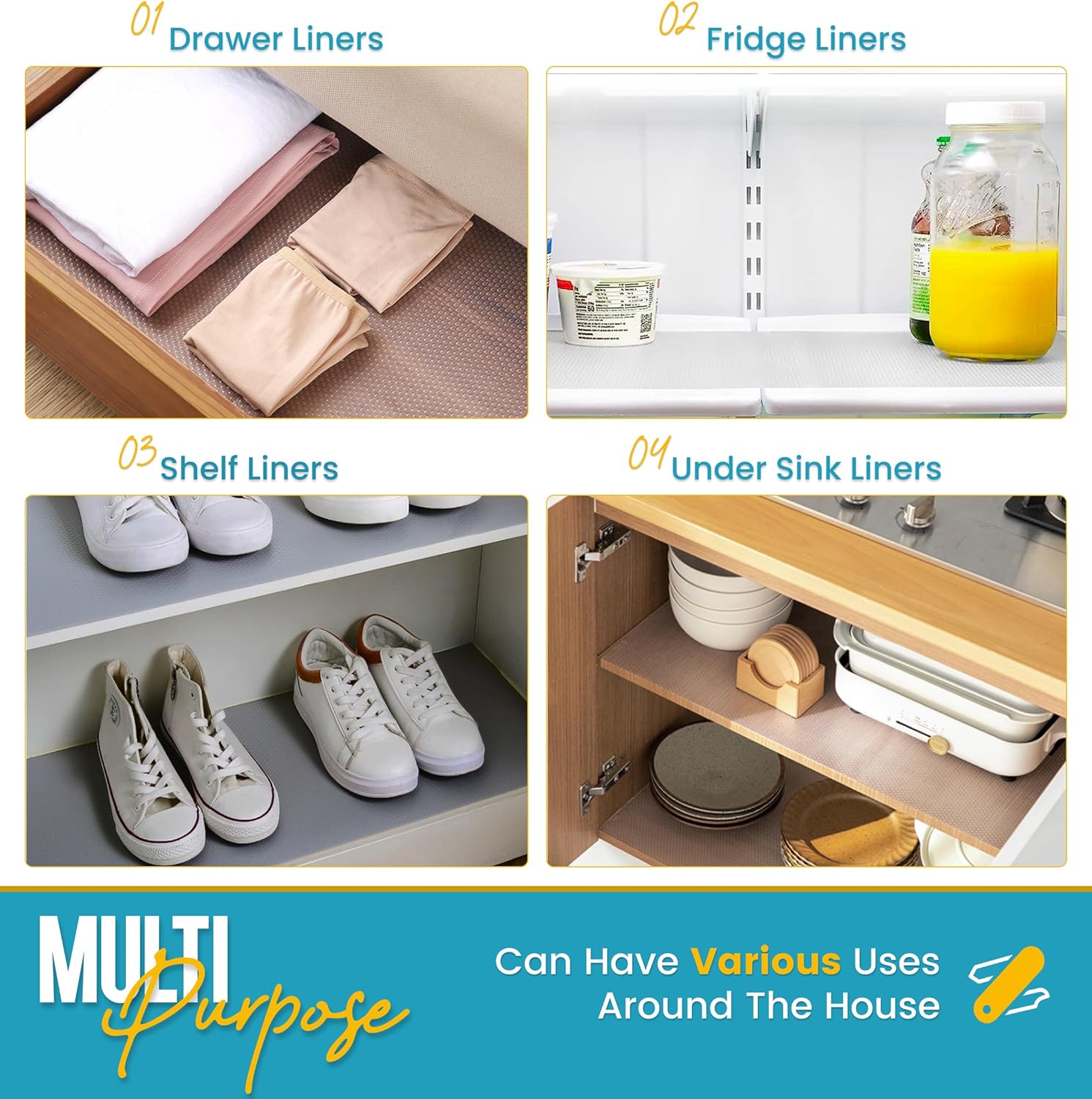 - MULTIPLE USES - These liners can work as fridge shelf liners, drawer liners and cabinet drawer liners - the uses are endless. Our fridge organizer liners are a must have kitchen organization gadgets for homes and kitchen accessories. Simply cut to size using scissors to fit the liner mats anywhere in your house, as needed