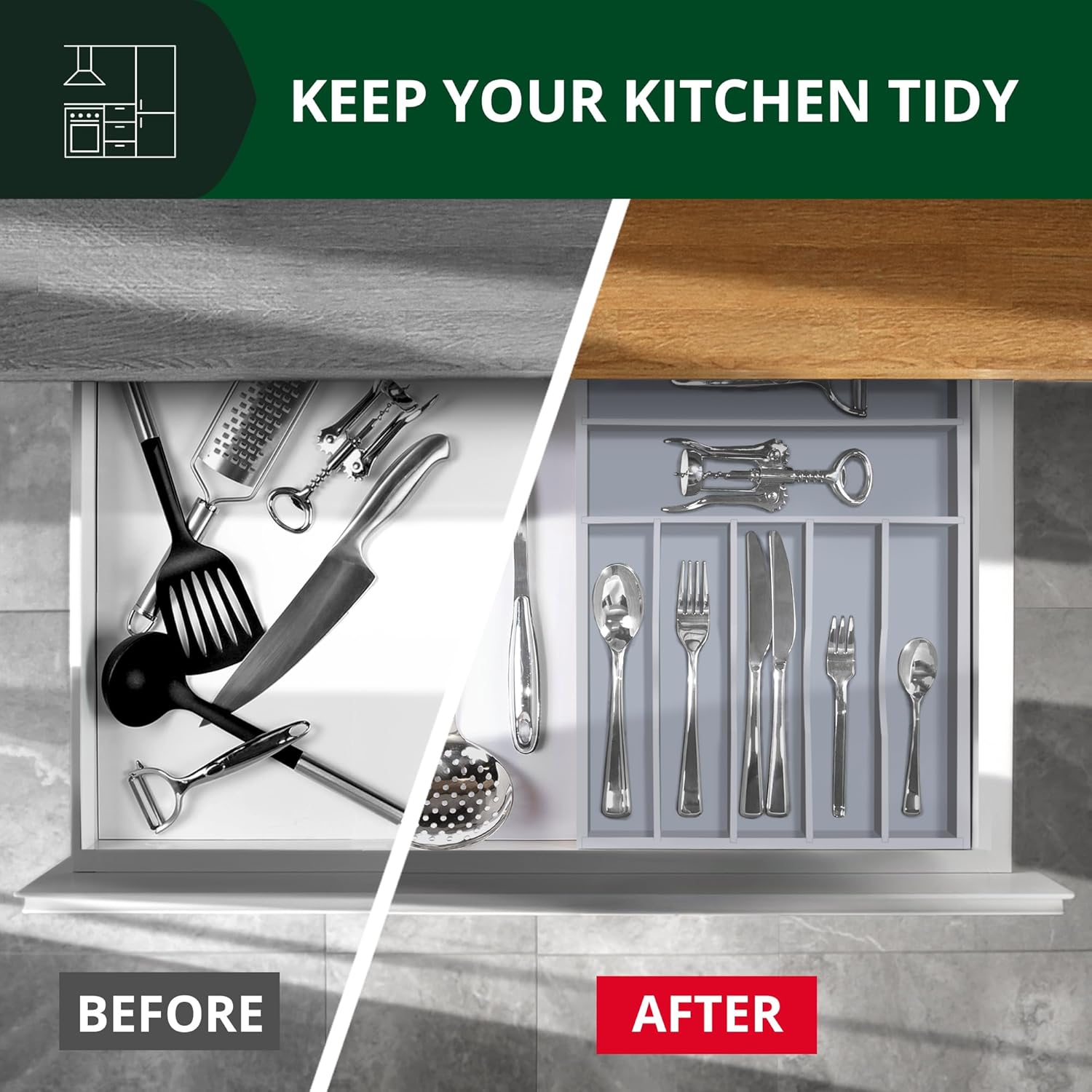 - πΏπππ πππππππ ππππππ ππππππππππ ππππππππ πππ'ππ ππππ πππππππ π ππ: This bamboo drawer organizer is exactly what youβve needed to help get your kitchen in tip-top shape. It may become easy to fall into the habit of tossing small items into the nearest drawer, creating the dreaded junk drawer or kitchen utensil drawer with piles of mixed tools. Measuring 16.3"x12.3", with 7 convenient 1.9" deep slots, conveniently organize and store your kitchen cutlery and rearrange flatware for a tidy, clean look