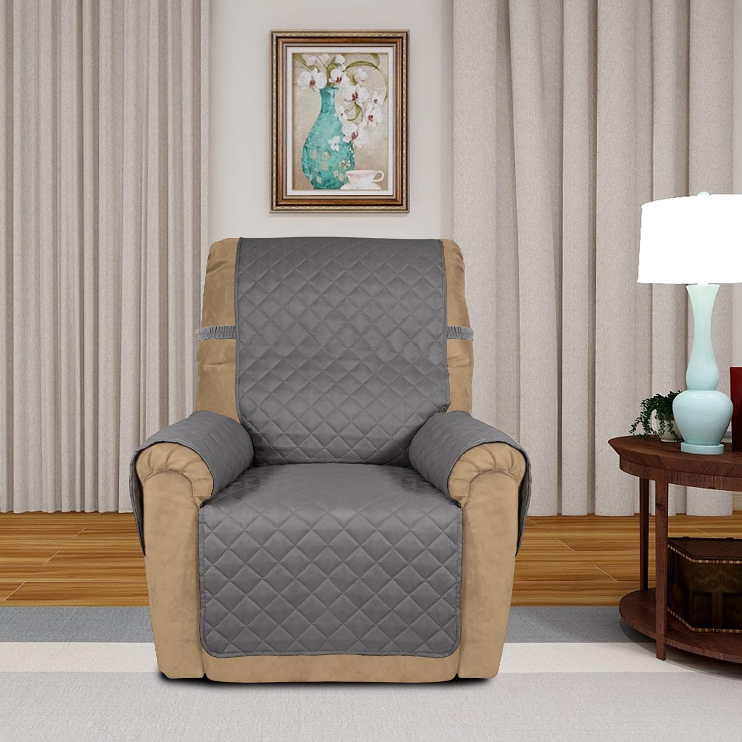 PureFit Reversible Quilted Sofa Cover, Water Resistant Slipcover Furniture Protector, Washable Couch Cover with Non Slip and Elastic Straps for Kids, Dogs, Pets (Small Recliner, Gray/Gray)