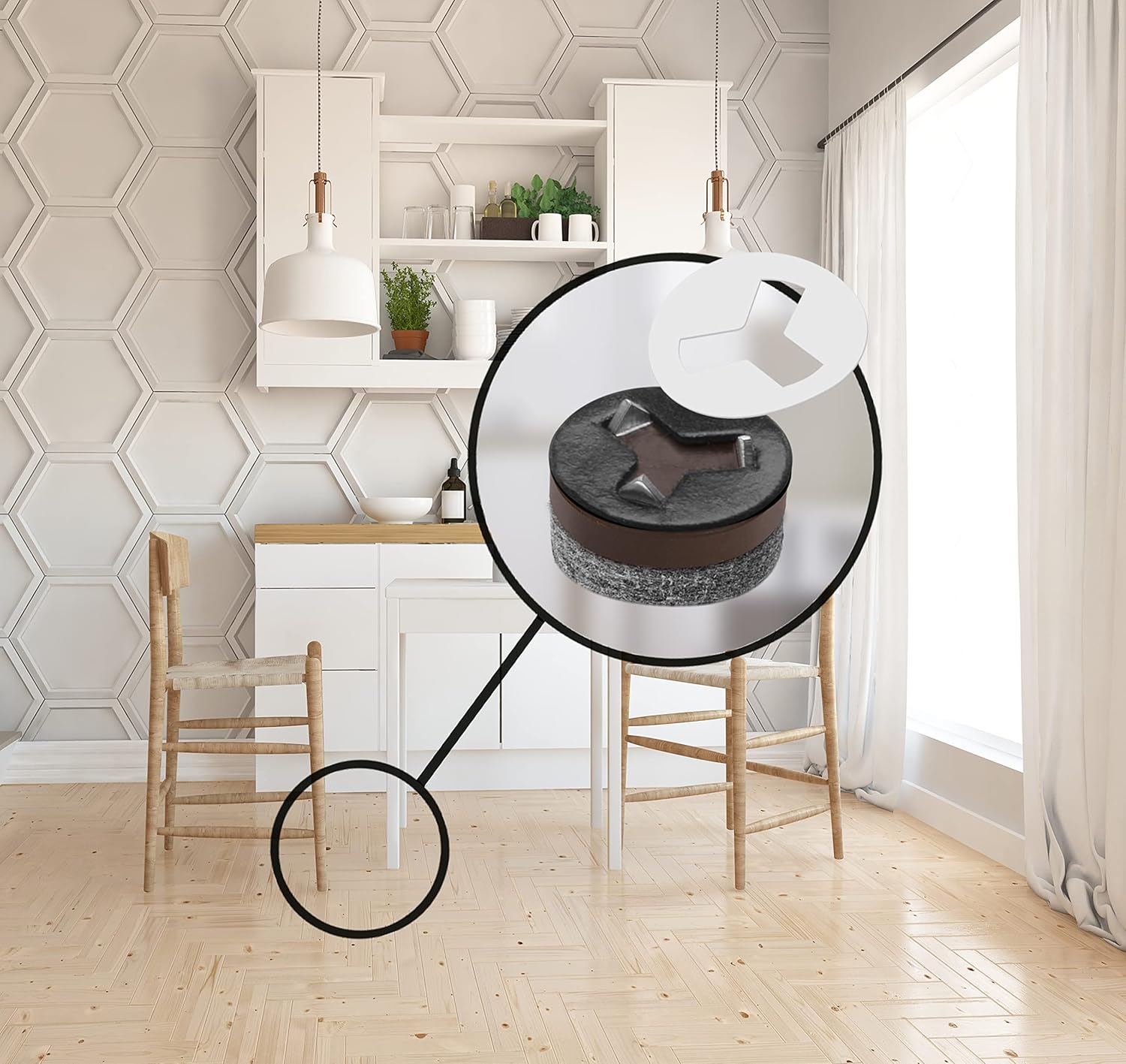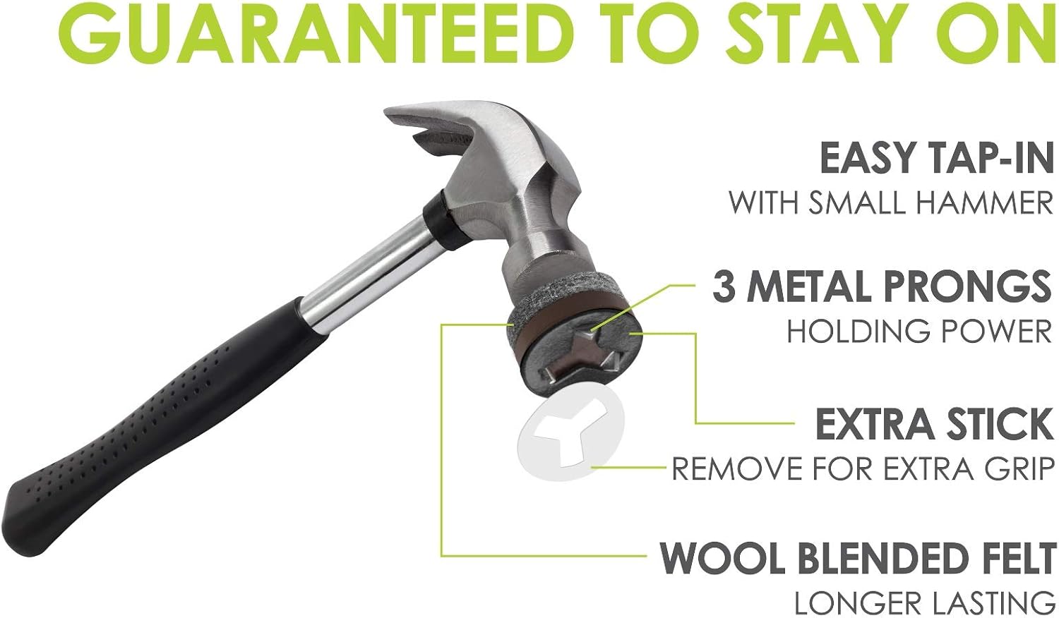 - Quick & easy tap on installation β Includes 16 x 3/4 inch round chair feet pads that install in seconds with the tap of a hammer, simply clean the bottom of chair legs, peel off adhesive backing from glides, position on furniture and then tap in felt furniture pads. Not for use on metal furniture legs or furniture legs made of hard material that can't be hammered into.