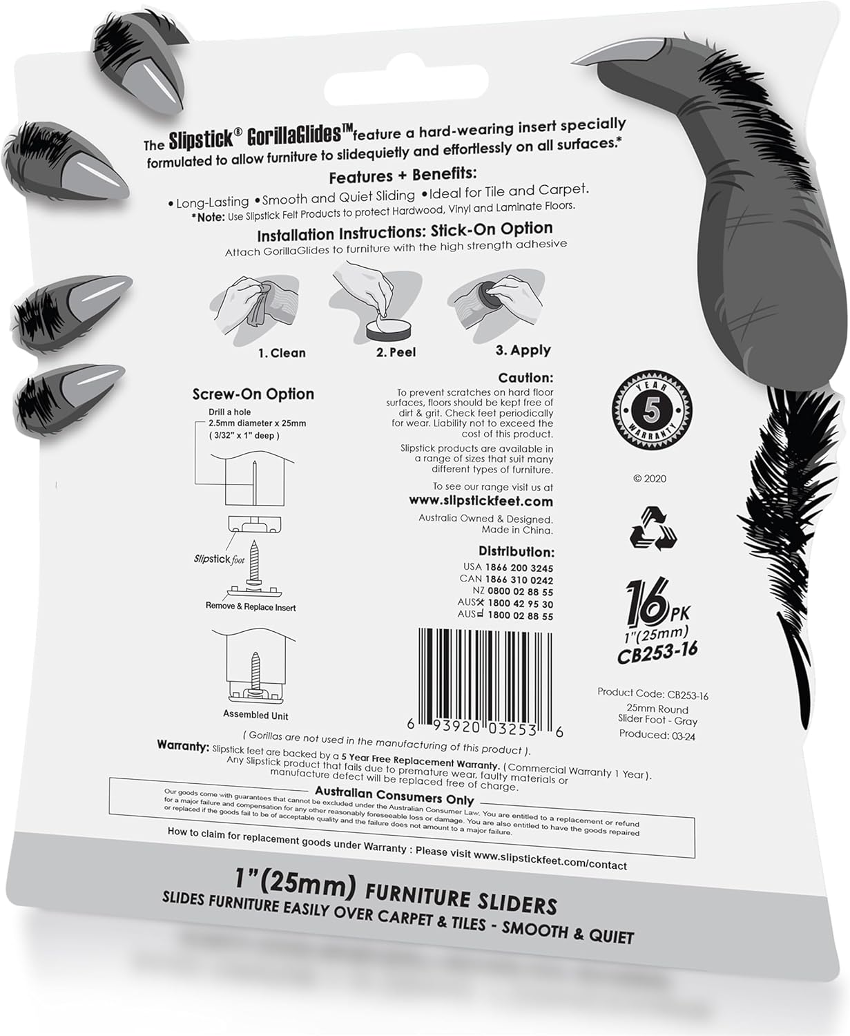 - GorillaGlides 1 inch furniture sliders by Slipstick are covered by a free replacement warranty should any product fail due to premature wear or defect. Furniture glide slider caps can be replaced and are sold separately, see GorillaGlides model CB254 1 inch plastic slider insert caps.