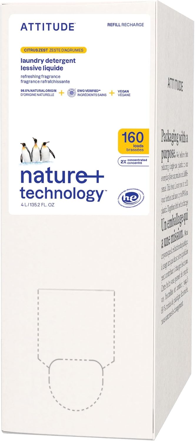 ATTITUDE Liquid Laundry Detergent Refill, EWG Verified, HE Compatible, Plant-Based & Vegan, Natural Laundry Soap, Citrus Zest Scent, 160 Loads, 135.26 Fl Oz