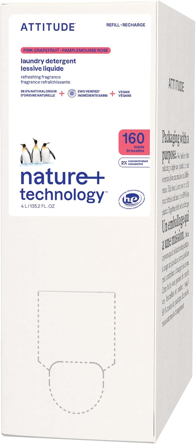 ATTITUDE Liquid Laundry Detergent Refill, EWG Verified, HE Compatible, Plant-Based & Vegan, Natural Laundry Soap, Pink Grapefruit Scent, 160 Loads, 135.26 Fl Oz