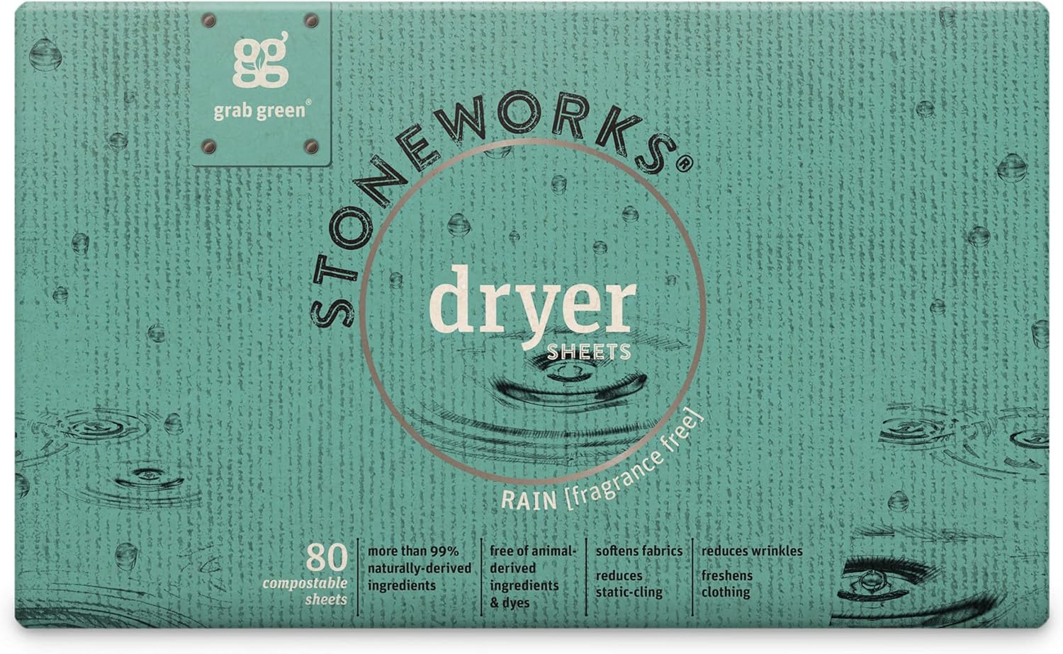 - Contains: 1- 50 Pod Bag of Grab Green Stoneworks Fragrance Free Rain Laundry Detergent Pods and 1- 80 Sheet Box of Grab Green Stoneworks Natural, Compostable Fragrance Free Rain Dryer Sheets