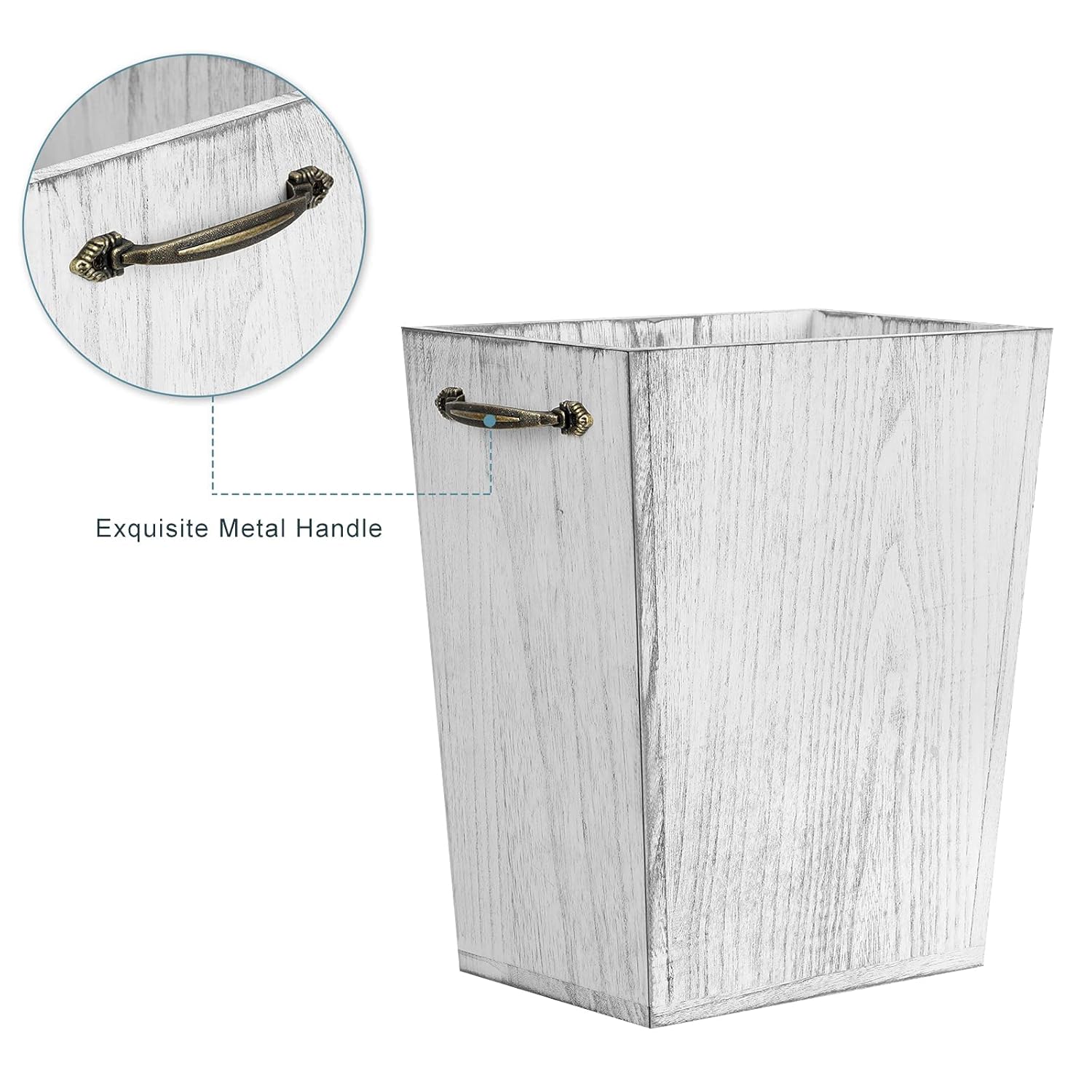 - 【Unique Design】The wood wastebasket with metal handles enables you to move the trash can easier and more conveniently. The square opening and rectangle bottom make the wastebasket not only easier to throw garbage but also a unique and cute decor in your room.