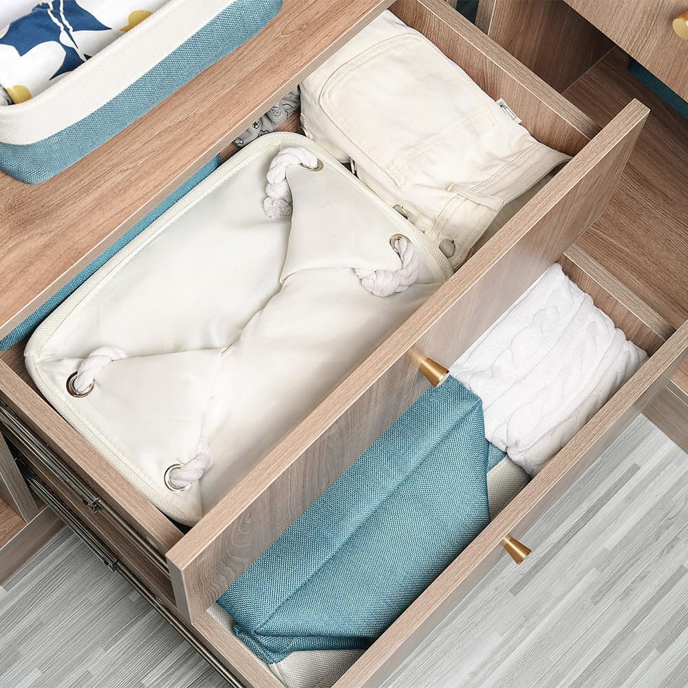 TheWarmHome Fabric Storage Bins Baskets for Organizing,Sturdy Storage Basket W/Handles, Decorative Foldable Storage Baskets for Shelves Closet Nursery Toy (White&Teal, Medium - 3 Pack)