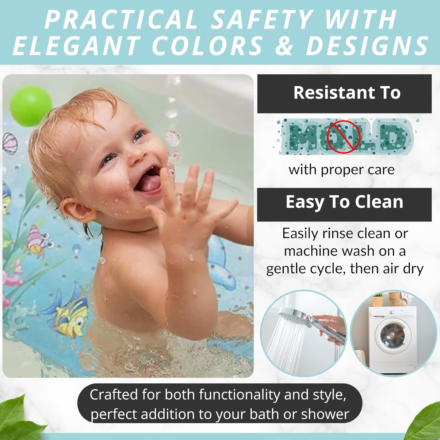 - COMFORTABLE AND NON-SLIP Boasting strong grip suction cups, this long bath mat firmly adheres to the bathtub floor, creating a stable and anti-slip environment to keep yourself and your little ones safe during bath time, ensuring a delightful and secure bath time experience for your little one.
