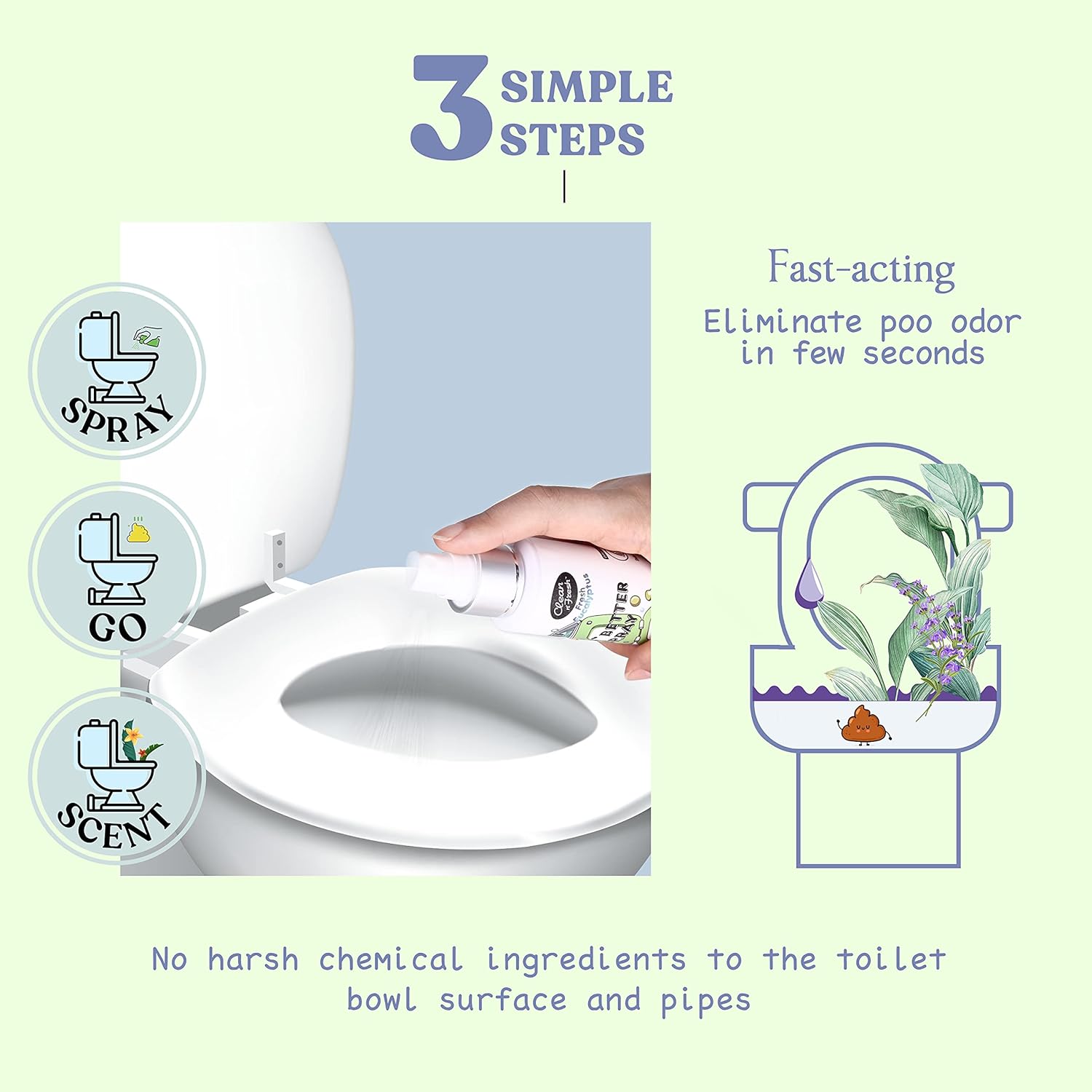 - PLANT BASED FORMULA: No Synthetic Fragrance, No Parabens, No Phthalates, No Aerosol, No Formadehyde and Cruelty Free. It isolate and neutralize the odor of poop in few seconds, Just spritz 2~4 sprays before go to the toilet