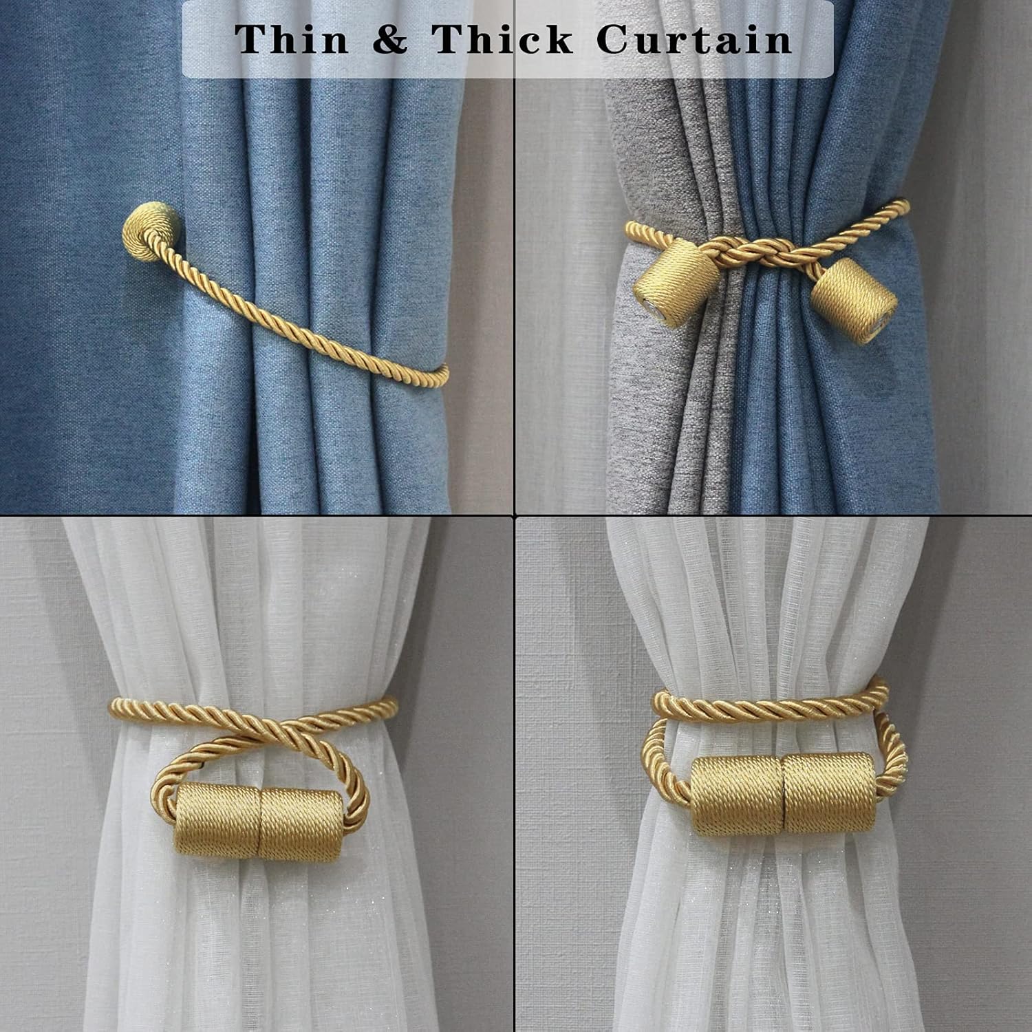 - Our products do not need to use hooks, Will not damage your walls. when you are not using tie backs for curtains, you can attach it to any position of the curtain without worrying that magnetic curtain holdbacks will be lost for the next use. Attractive modern look of these rope curtain tiebacks, perfectly match with your bedroom, living room, office and so on, and meet daily use. Best as a gift or for self use.