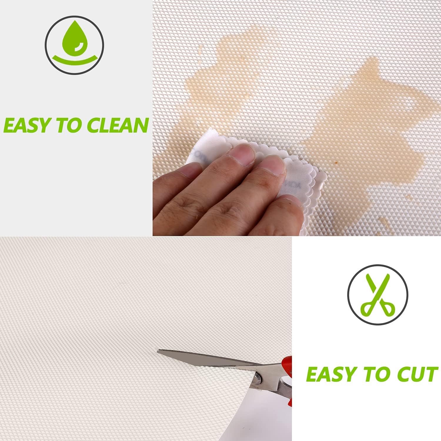 - EASY TO CLEAN AND CUT: When the kitchen shelf liner is stained with oil or other dirt, you can easily wipe it with mild soap or a damp cloth. This cupboard liner has the most popular pre-cut sizes so that you can easily cut it to any shape or size you want with scissors or a knife.