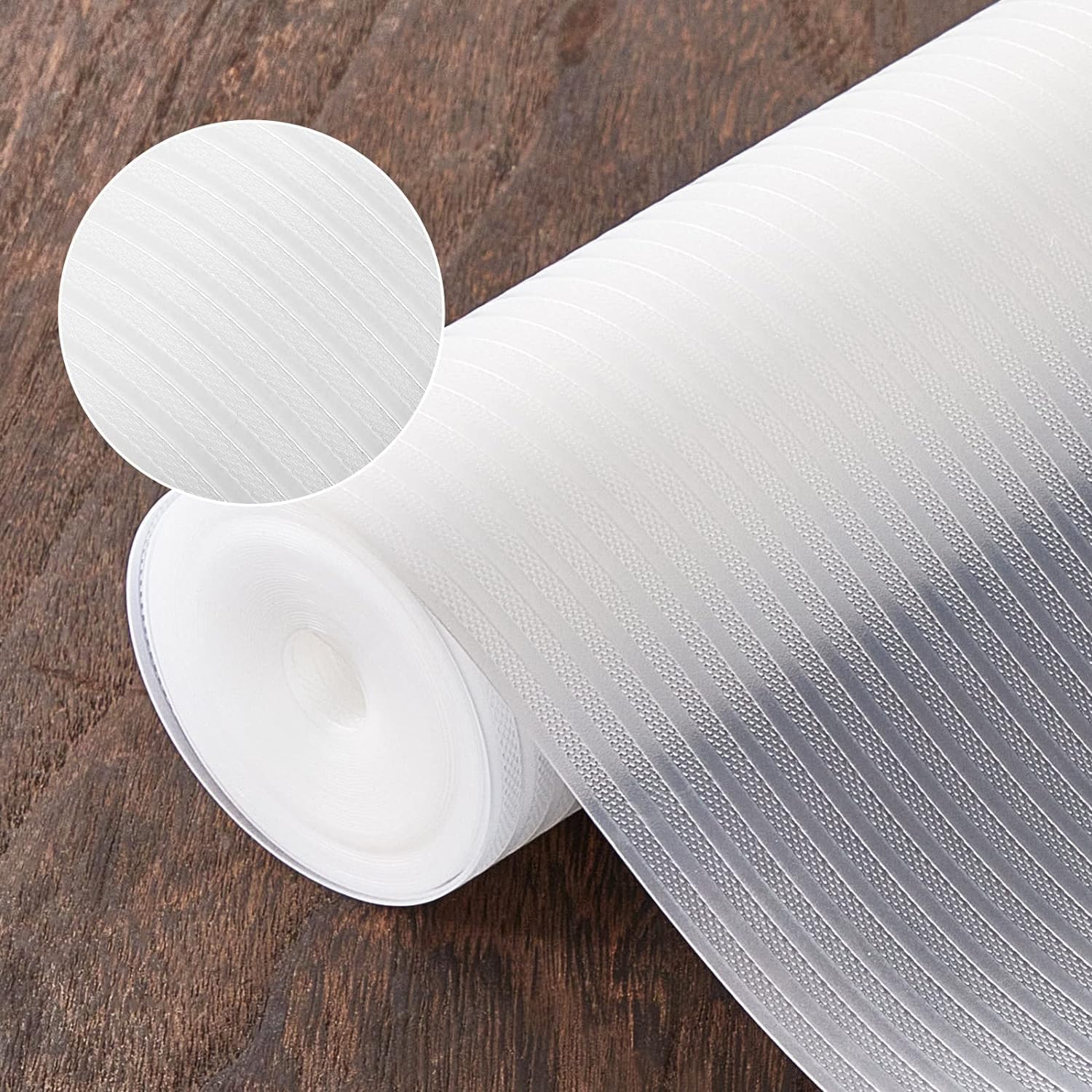 - ăREDUCE SLIPPINGă: The clear shelf liner one side designed with durable long stripe pattern, which prevent items from slipping on cabinet shelves or drawer. Another non-adhesive smooth surfaced side can be easily removed and leave no residue.
