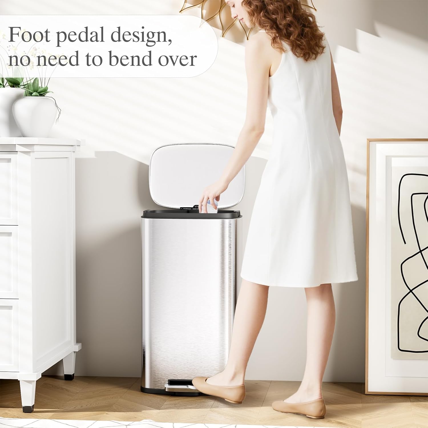 - ăPREMIUM &DURABLE MATERIALăTrash can is made of brushed stainless steel, which not only has an elegant and fashionable appearance, but also has excellent performance and is very durable.The surface of the garbage bin is not afraid of water, oil, fingerprints, or scratches, and it can maintain its luster for a long time.