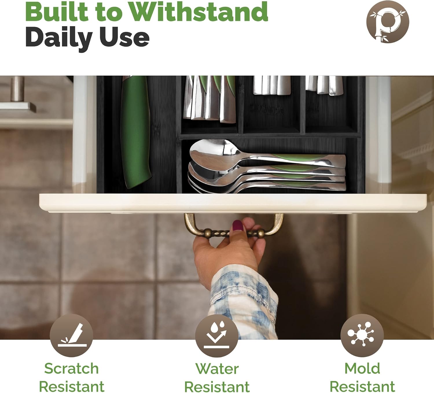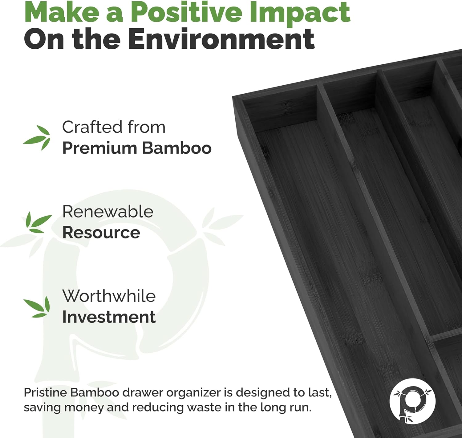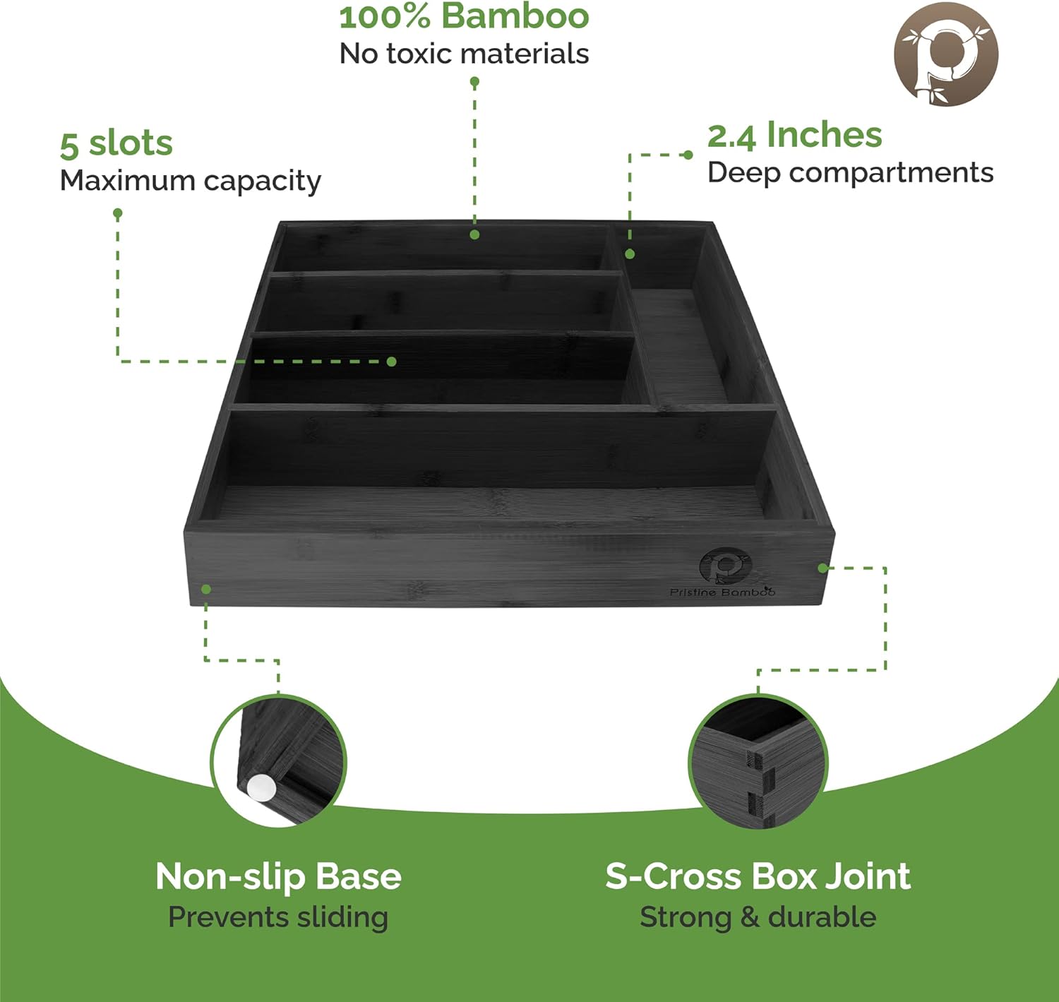 - SUPERIOR DESIGN SOLUTIONS: When you need a drawer organizer that is both beautiful and practical, there's no better option than the 10-inch Pristine Bamboo Silverware Drawer Organizer. This all-inclusive product offers 100% bamboo construction with No Toxic MDF material for strength--even its base! It also includes slip-resistant feet, so your items stay put even when moving around.