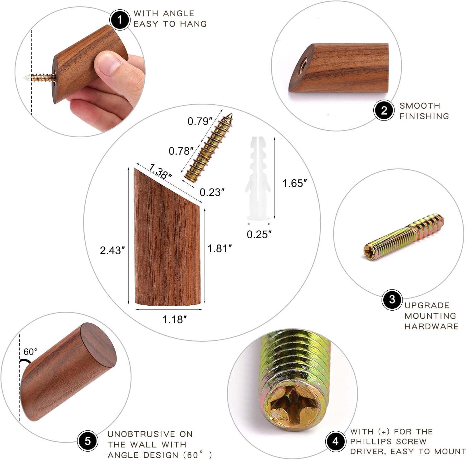 - UPGRADE INSTALLATION: We have upgraded the screw with a notch (+) for the Phillips screwdriver. So it is easier to install. 1) Drill a hole. 2) Hammer the anchor into the wall. 3) Screw into the wall anchor with a driver. 4) Twist the wood-hook into the screw and tighten it to the wall with a proper angle (mounting hardware included)
