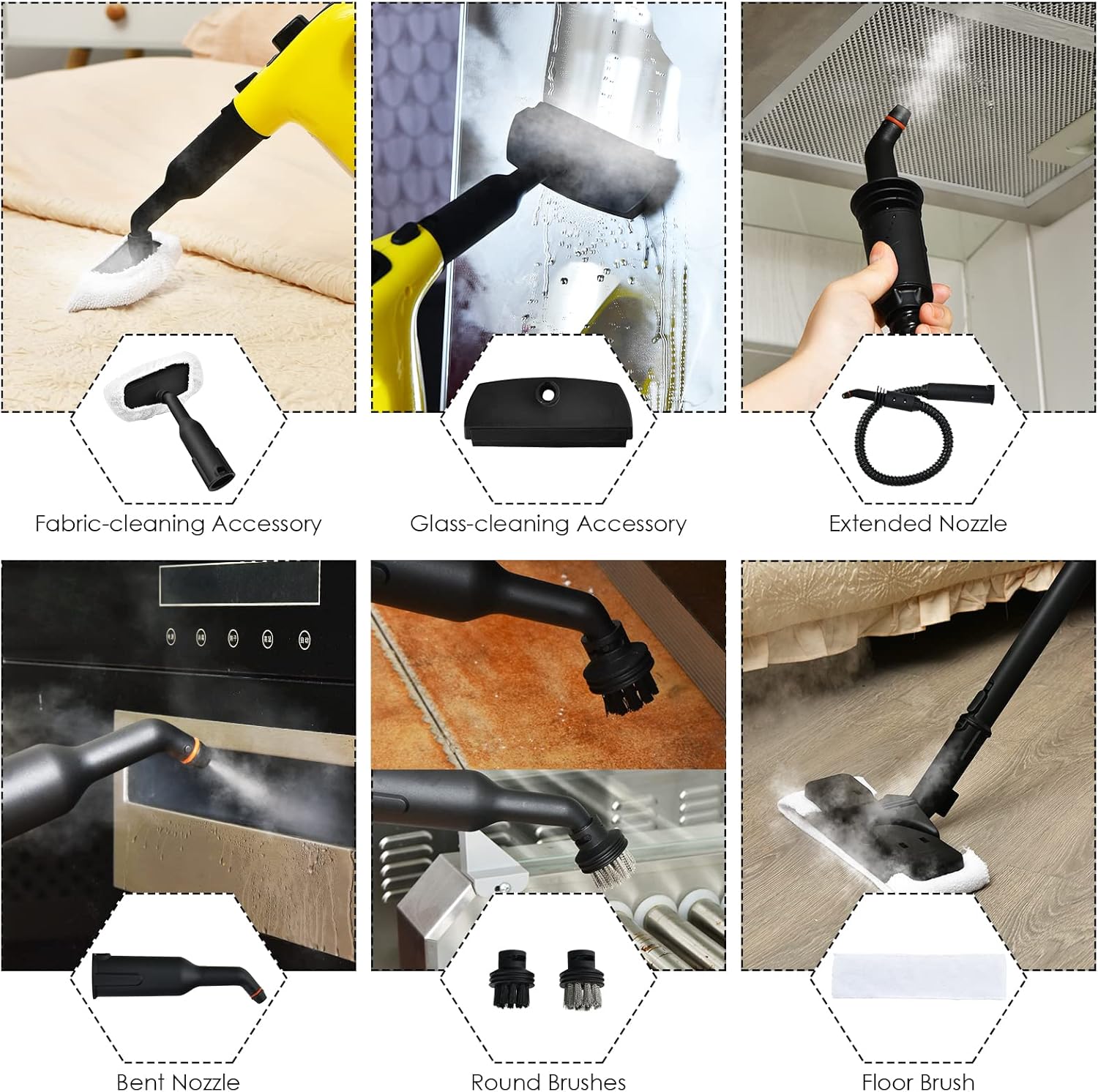 - đ ăComplete Accessory SetăThe steam cleaner comes with a complete set of cleaning accessories, including nylon brush, floor brush,big nozzle, funnels, measuring cups, etc.,to meet different cleaning needs. The handheld steamer is great for cars, mattresses, wallpapers, windows, stoves, countertop, sofas and other sealed surfaces such as ceramic, glass, marble, hardwood floors, etc.