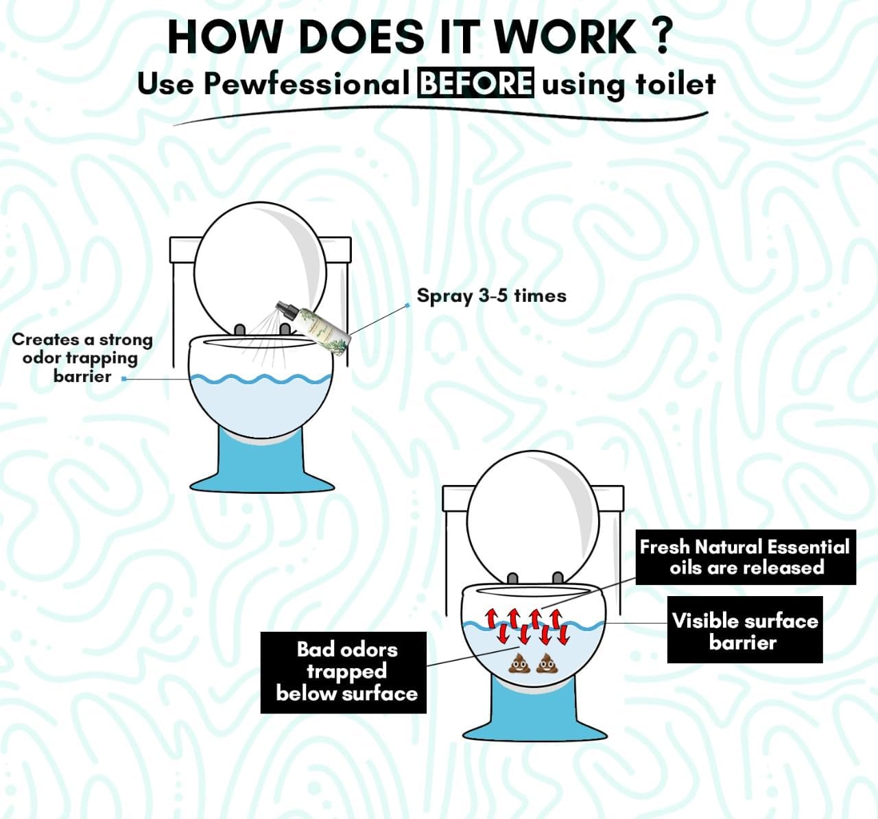 - ACHIEVE FANTASTIC PERSONAL HYGIENE: Pewfessional Poop Spray odor eliminator ensures nasty poo smells stay trapped under the toiletโs water surface. Our proven formula works as a toilet Pooh odor eliminator by creating a strong, visible odor barrier that locks embarrassing toilet odors in the bowl before they can escape.