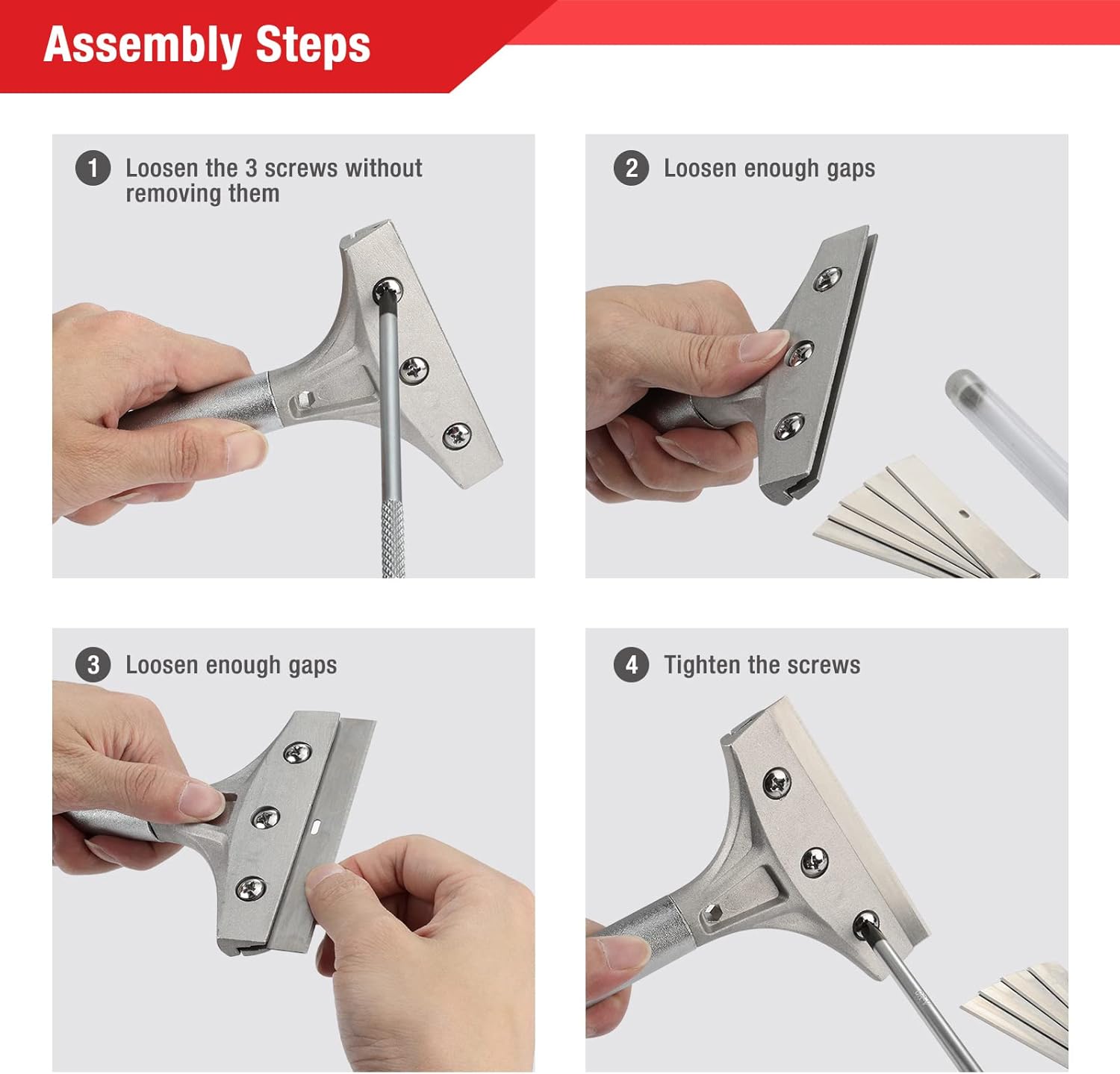- 4'' Scraper with 12'' Long Handle: 4 inch wide scraper helps you remove stains in larger cleaning area. The 12 inch steel heavy duty long handle will give you greater reach and leverage; Simple installation: 1. 3 screws holding blade in place 2. Loosen screws and carefully reposition blades so that the razor edge is facing out 3. Tighten screws