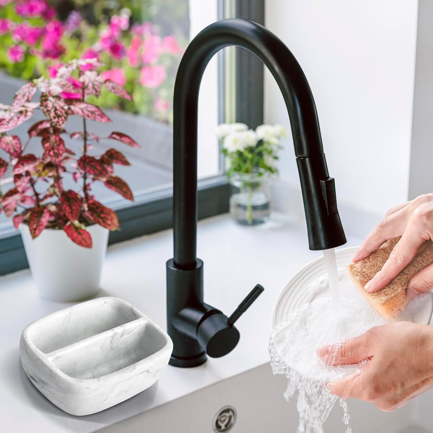 - This kitchen sponge holder is functional with it's simple bowl design and will add the perfect amount of modern charm to your sink area with the elegant white marble pattern