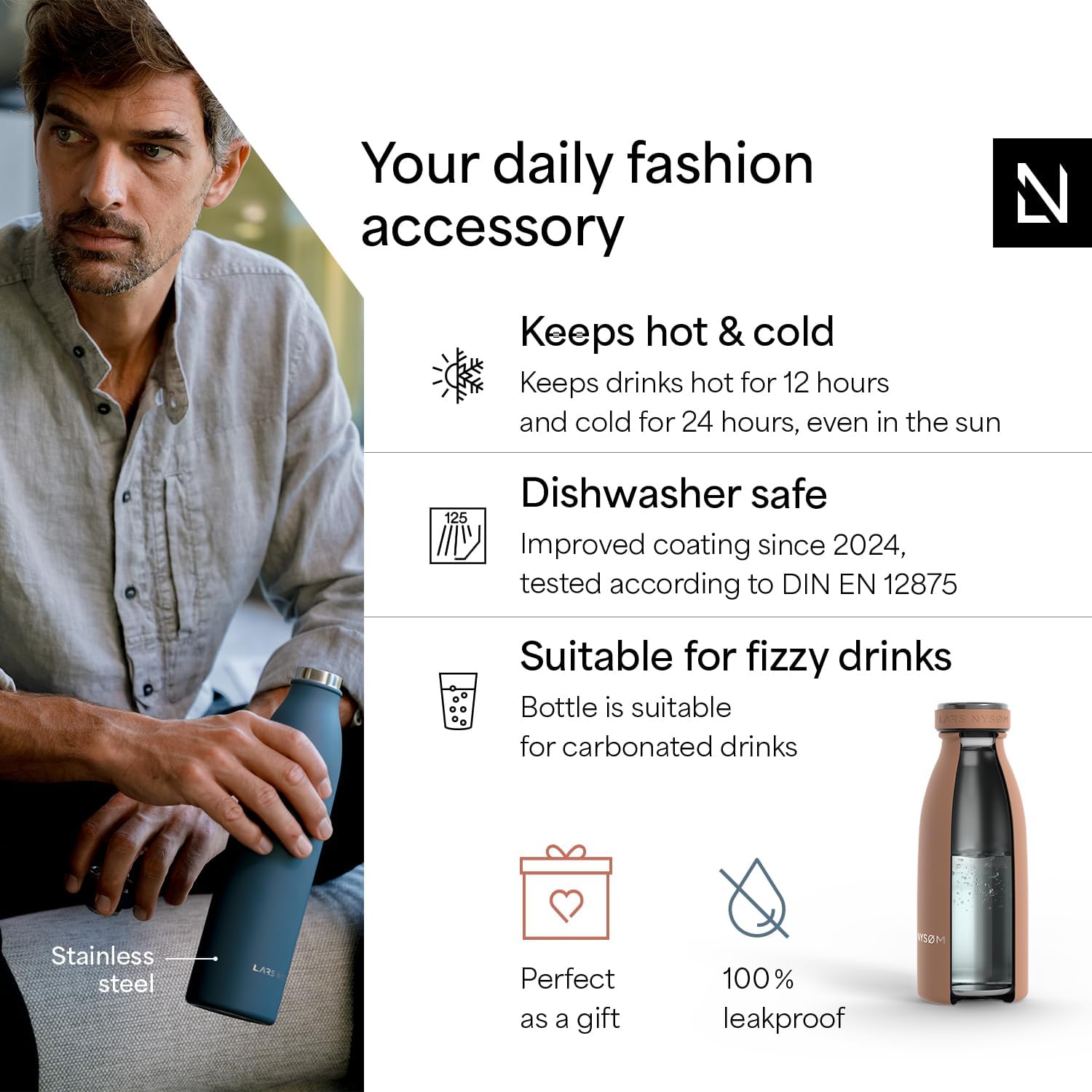 - IDEAL GIFT: The water bottle is perfect as a gift for Christmas. The sports bottle is made of high-quality 18/8 Stainless-Steel and is ideal for carbonated drinks, water and juices.